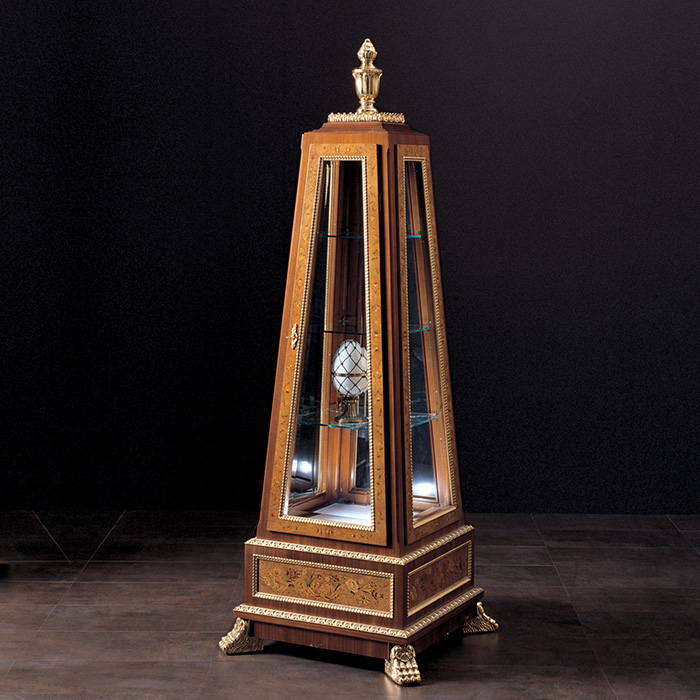 Glass cabinet “PIRAMIDE”, veneer in walnut and maples.