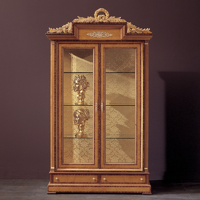 Glass cabinet “BIEDERMEIER” (1815-1848), veneer in ash brier, purple heart and rosewood. Gold carved wood.