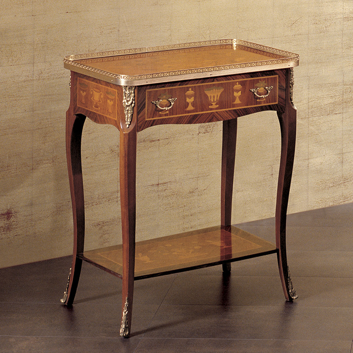Lamp table “LUIGI XV” (1722-1774), veneer in rosewood and bois de rose with polychrome wood marquetry.
