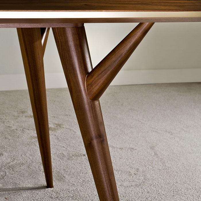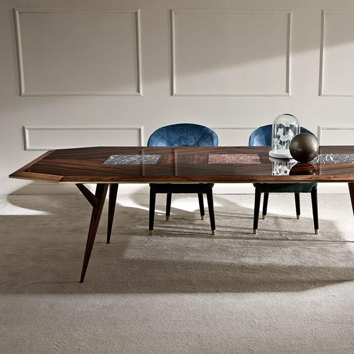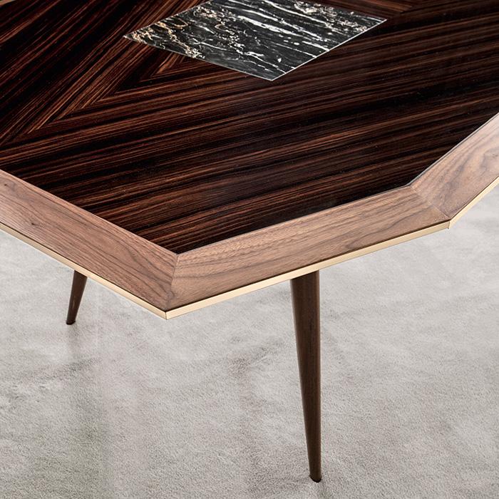 Table with legs and frame in matte Canaletto walnut. Top in glossy Macassar ebony and inserts in black Portoro and red Levanto marble. Details in brushed brass.