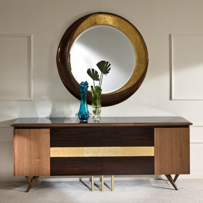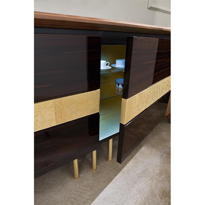 4-door sideboard in glossy Macassar ebony and matte Canaletto walnut. Top with Levanto red marble. Door with gilt carving; legs turned in walnut and brushed brass. Interiors lacquered in matte black and gold leaf. Includes shelves and LED lights. 85″ x 21″ x 31.9″ h.
