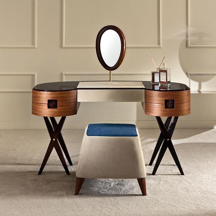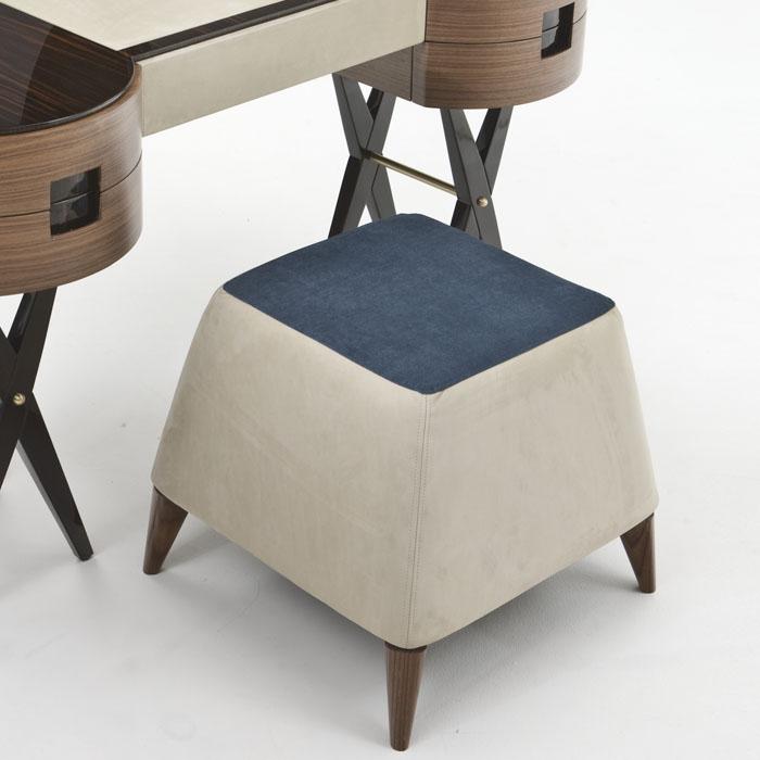 Padded stool with turned legs in matte Canaletto walnut.