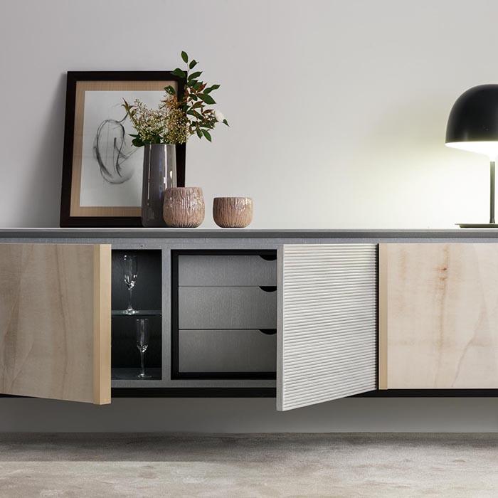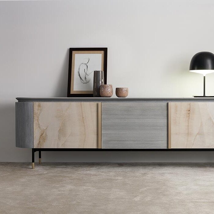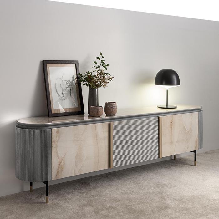 Sideboard with three doors in open pore gray decapè oak with solid wood slats in relief; top and two doors in ecomarmo. Base in matt anthracite painted metal and turned legs with brass tips. Interior equipped with crystal shelves and chest of drawers.
