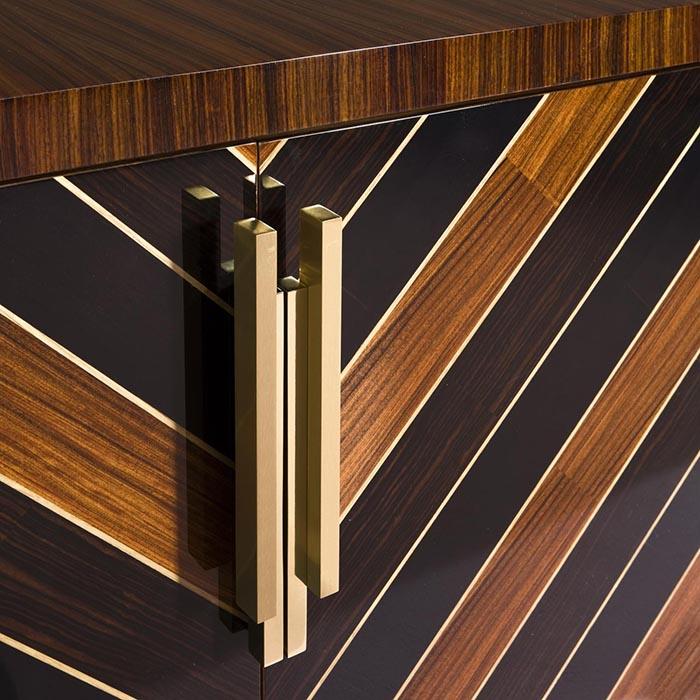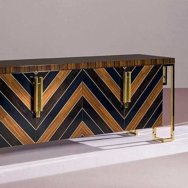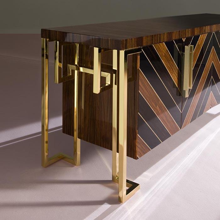 Sideboard with 4 doors, inlayed in rosewood, ebony, oak and black pear. Legs and handles in golden metal.