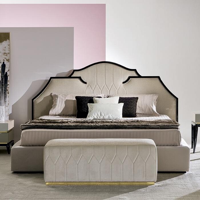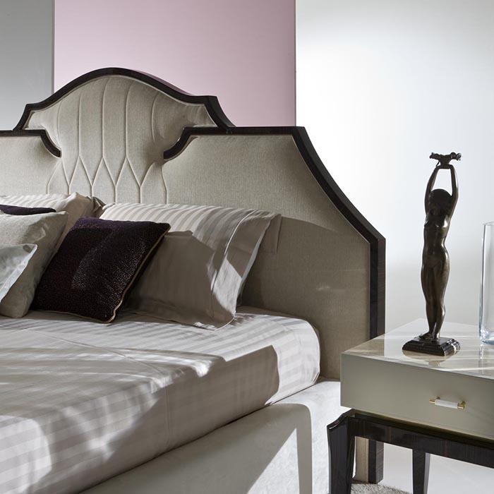 Upholstered bed with ebony frame.