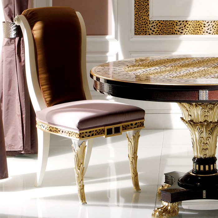 Chair. White lacquered, gold leaf relief, details in printed snake leather. Applications in Swarovski crystals.