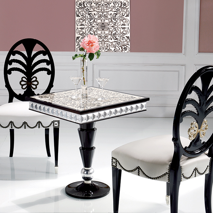 Lacquered small table, inlayed top. Details in silver leaf. Applications of Swarovski crystals.
