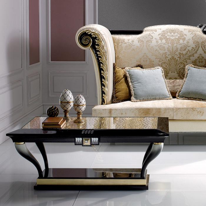 Lamp table with black and white lacquered finish and gold leaf details. Applications of Swarovski crystals and leather with glass top.