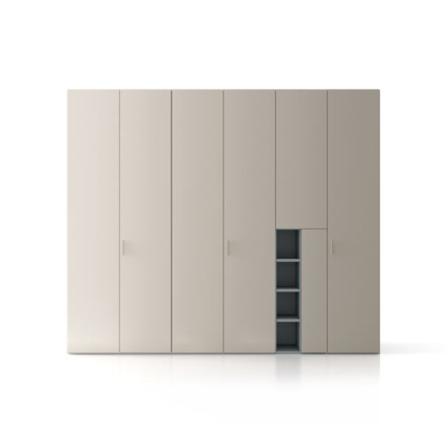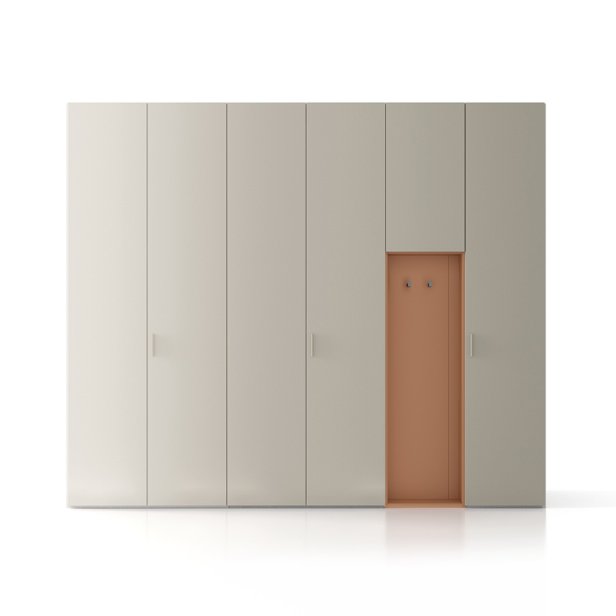 The first is a shoe-rack compartment, separate from the rest of the wardrobe. Clothes hooks can also be applied to the doors.