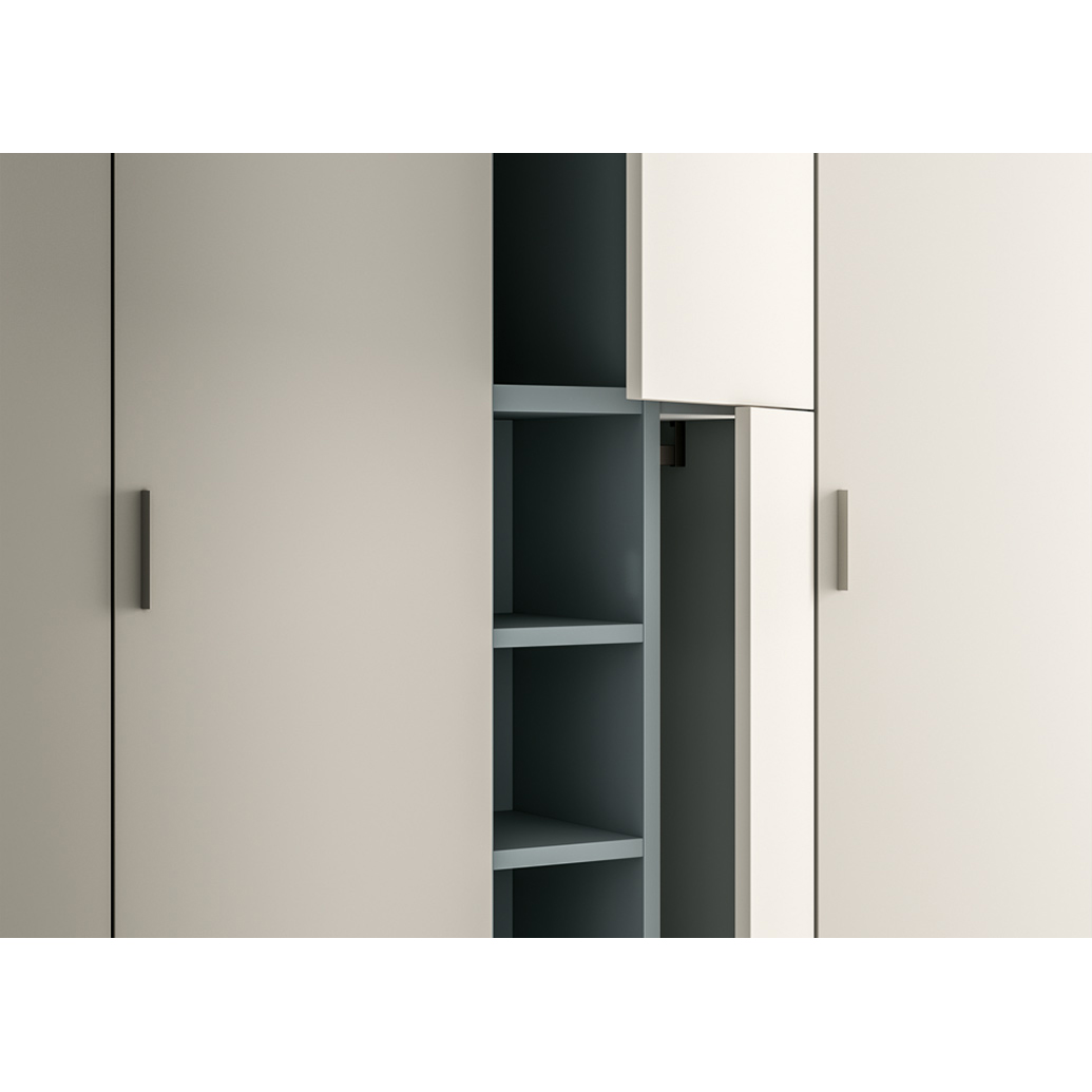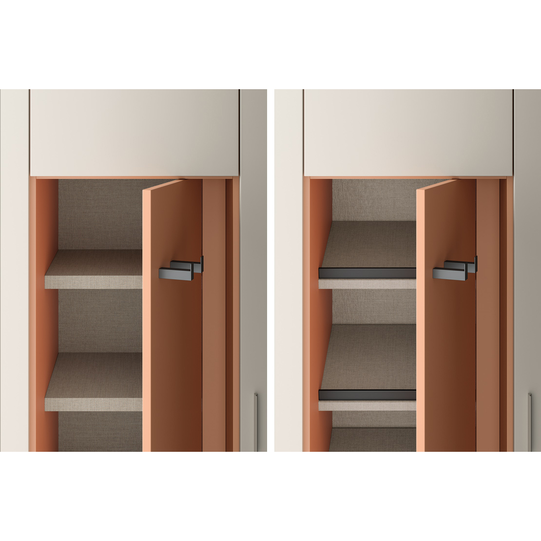 Standard or angled shoe-rack shelving can be positioned inside the shoe compartment. These elements are finished to match the wardrobe interiors.