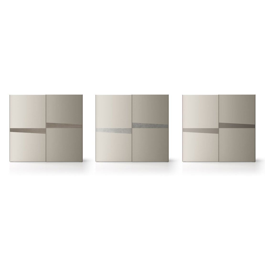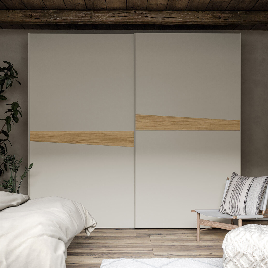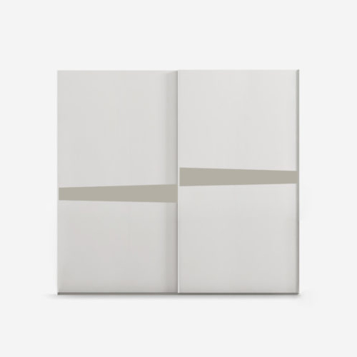 The uniform design of the sliding wardrobe doors is shaken up by an asymmetrical insert across the middle. Available in different finishes, it adds character to simple style.