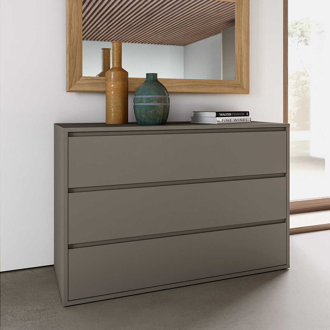 The drawer unit is practical and generously sized. It opens to reveal spaces designed to store all things comfort, in the room dedicated to relaxation par excellence. The neutral finishes and clean lines create a relaxing atmosphere.