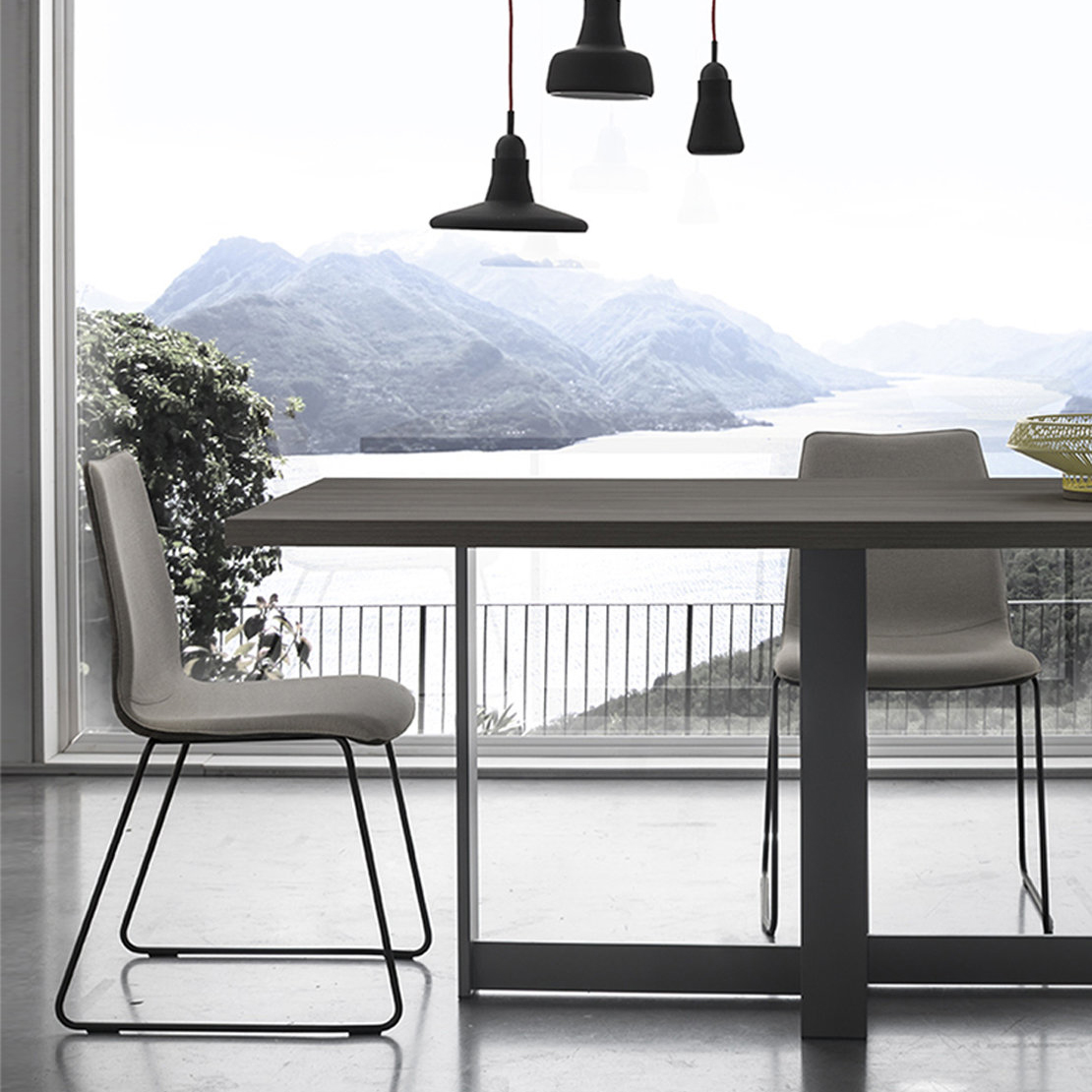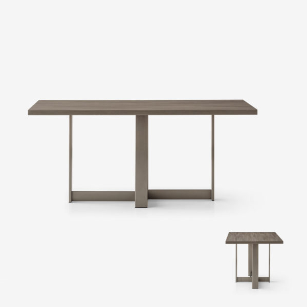 A rectangular table with a top available in wood grain or Eco colours, and a frame in three metallic shades.