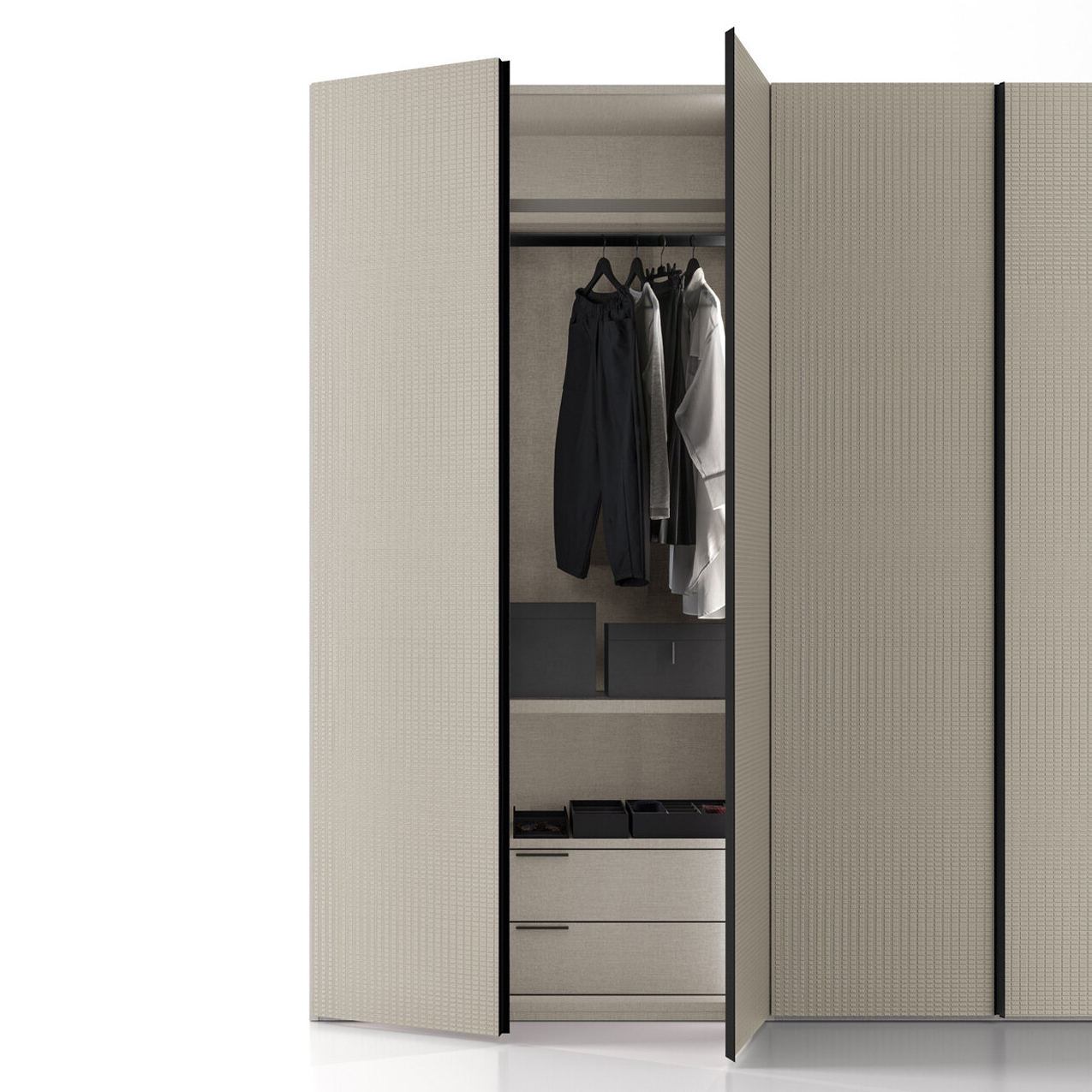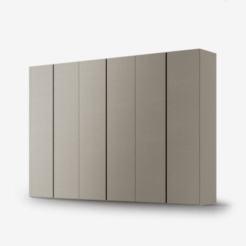 The hinged wardrobe is also available in the Tissù finish, which comes in two colours: Bianco and Limo.