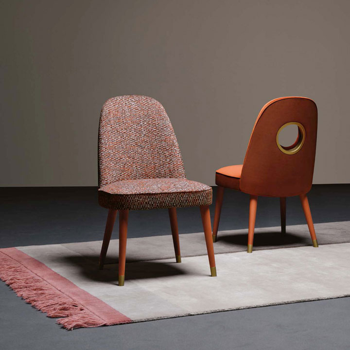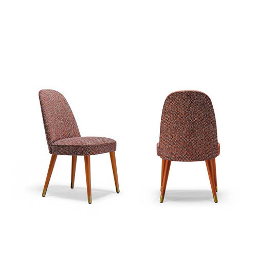 A chair with classic forms, enriched with details to enhance its comfort and beauty: the slight inclination of the backrest, the wide seat, the slender legs.