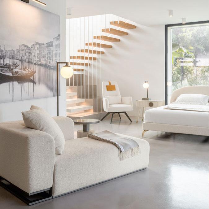 The upholstery with rich fabrics enhances the shapes. The combination of different colors is a tribute to elegance and emphasizes the delicacy of the design.