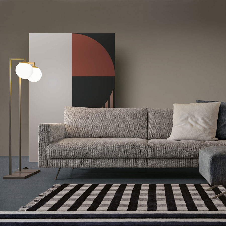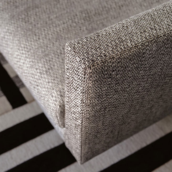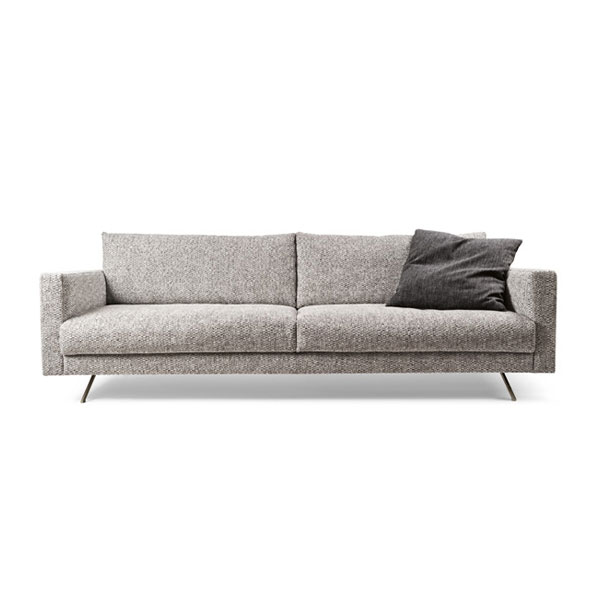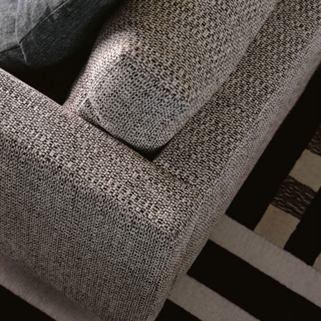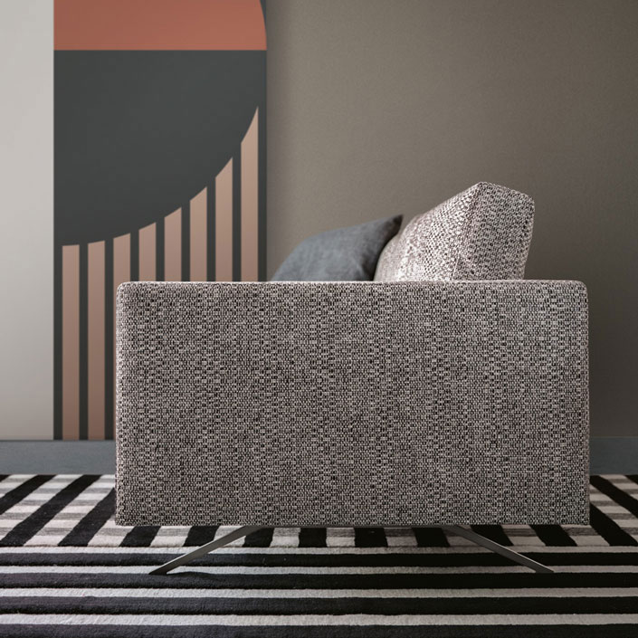 Linear yet comfortable shapes for the sofa in salt-pepper fabris. A male elegance defined by the base in titanium finish.