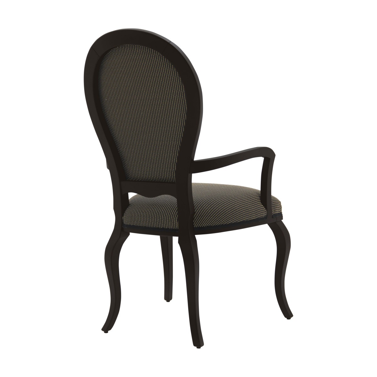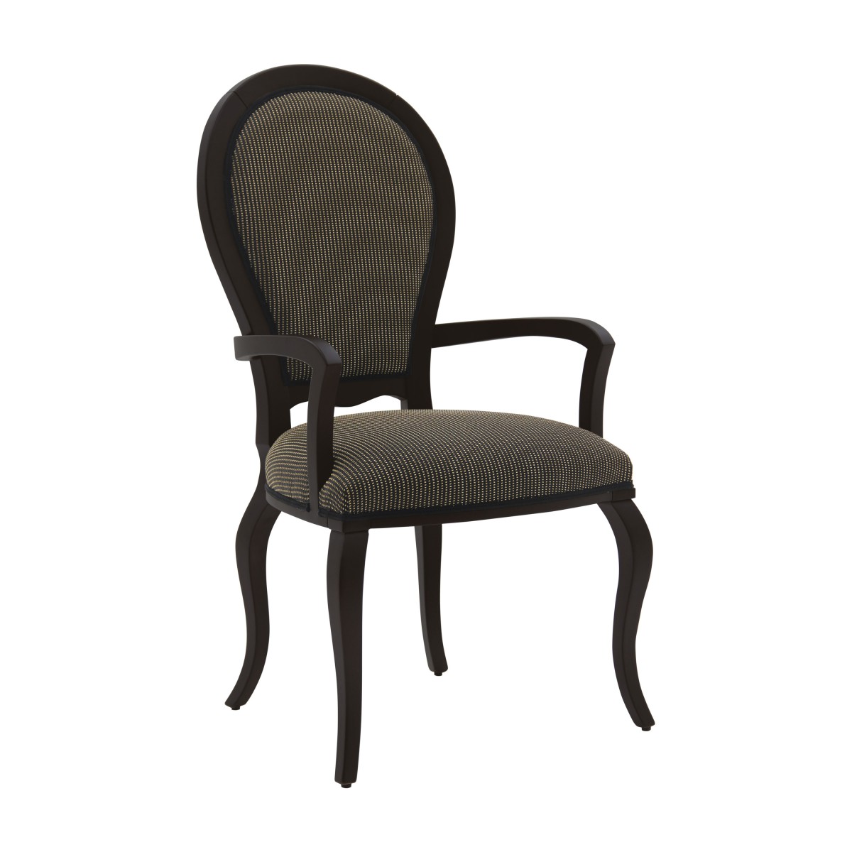 Elegant contemporary style small armchair with beech wood structure featuring simple and sinuous lines. The seat is padded with webbing and superior quality foam. The upholstery can be customized with nails, braiding, double welt or welt.