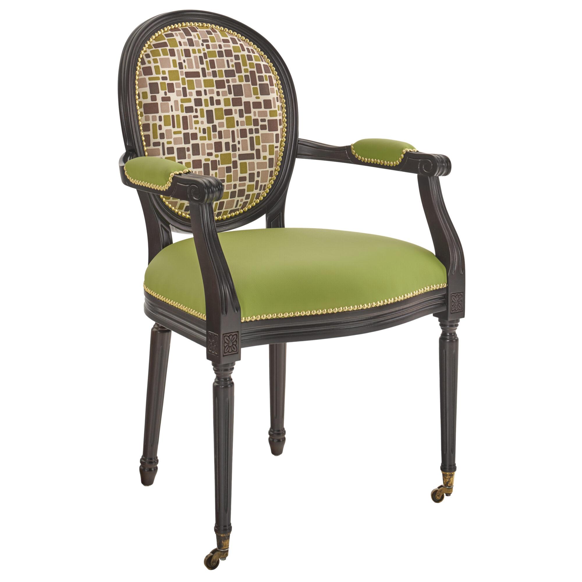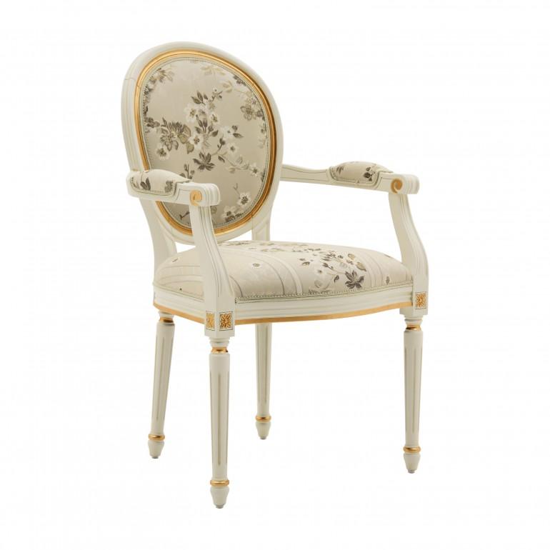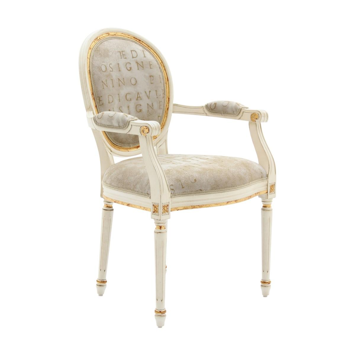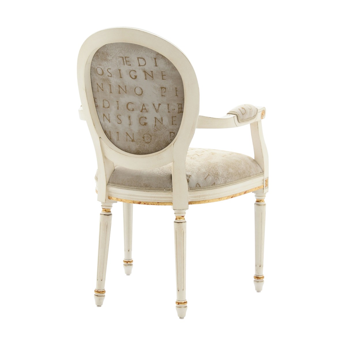Comfortable classic style small armchair with beech wood structure with lines reminiscent of the Louis XVI style. The carvings on the legs can be enhanced with a silver or gold leaf lacquer finish. The seat is padded with webbing, springs and superior quality foam. The upholstery can be customized with nails, braiding, double welt or welt.