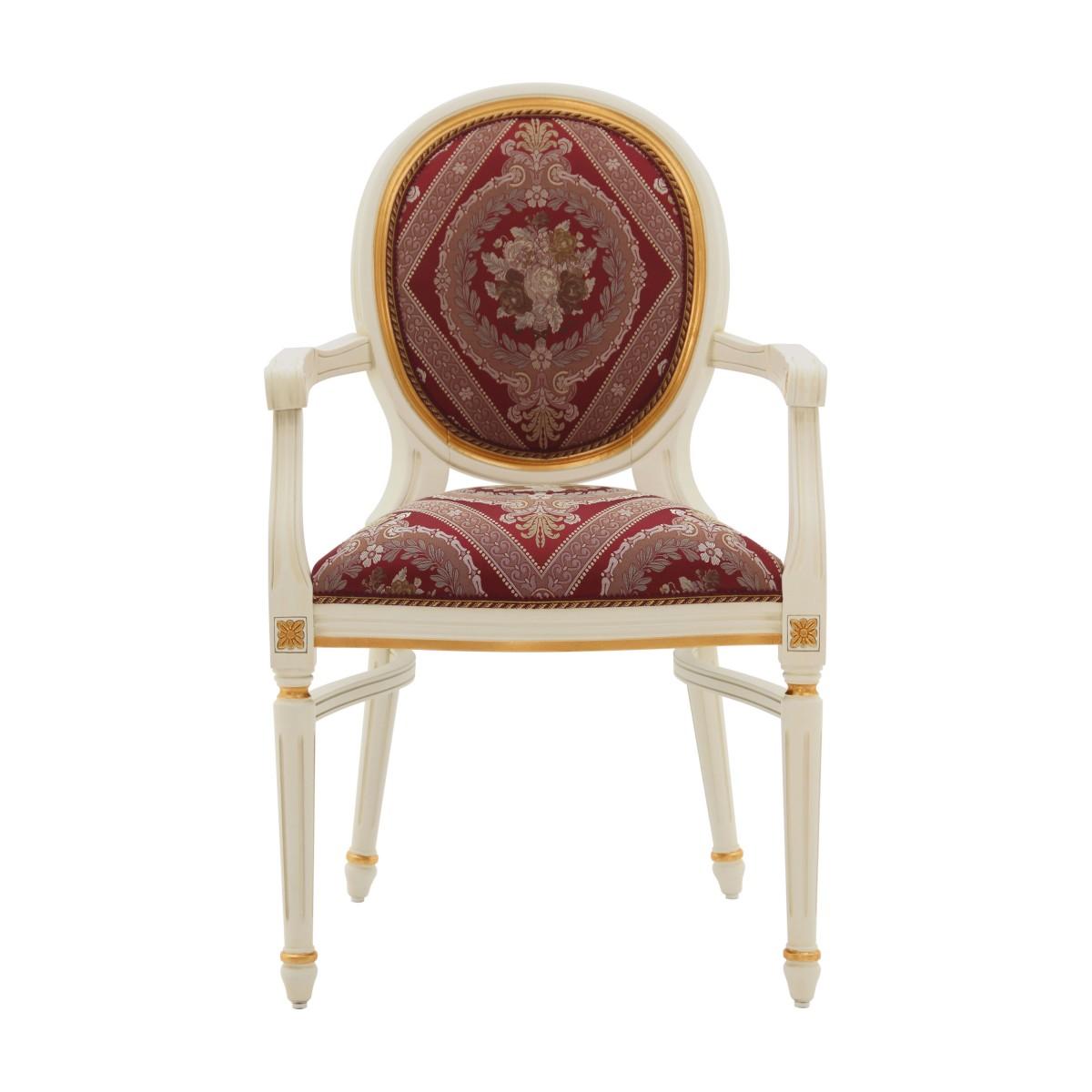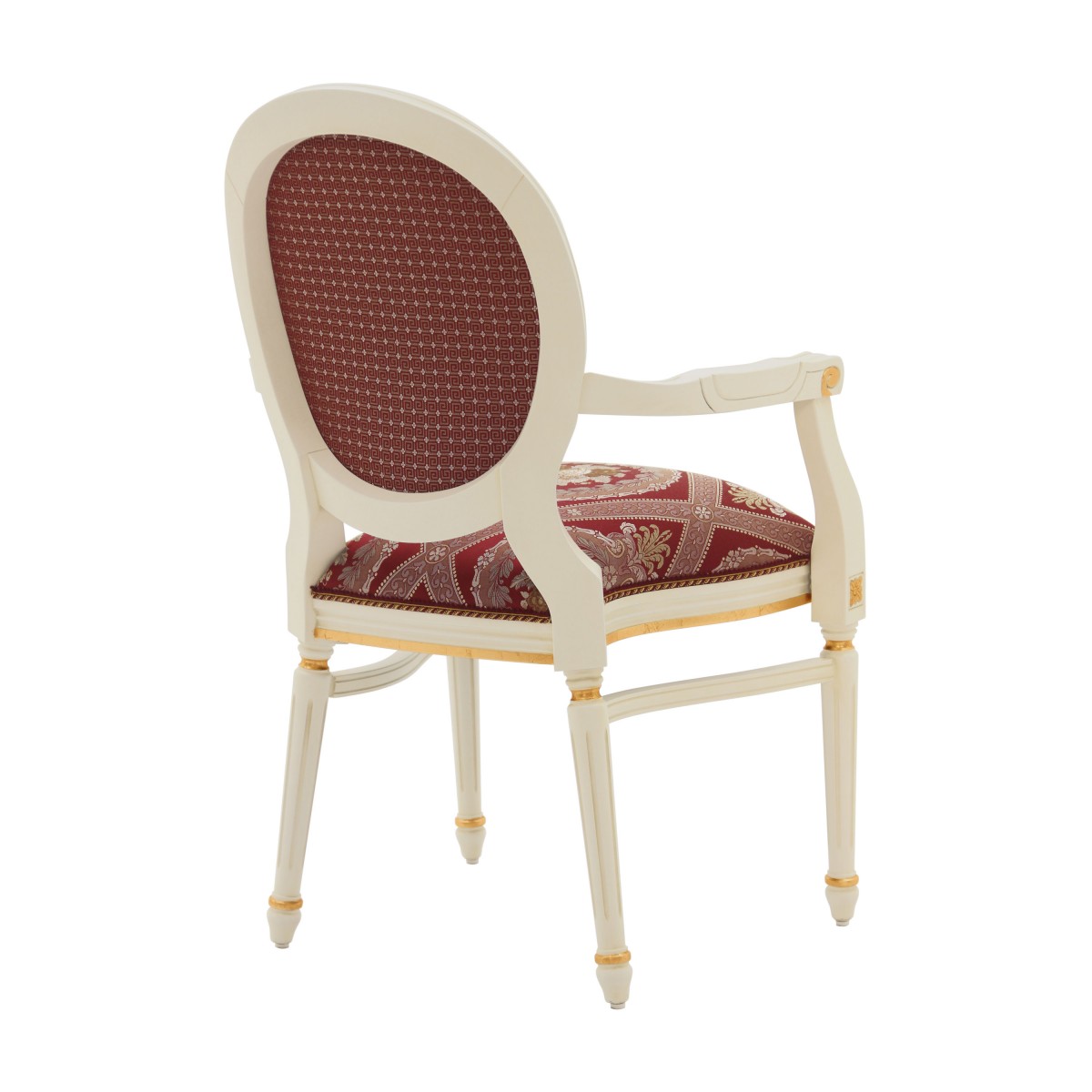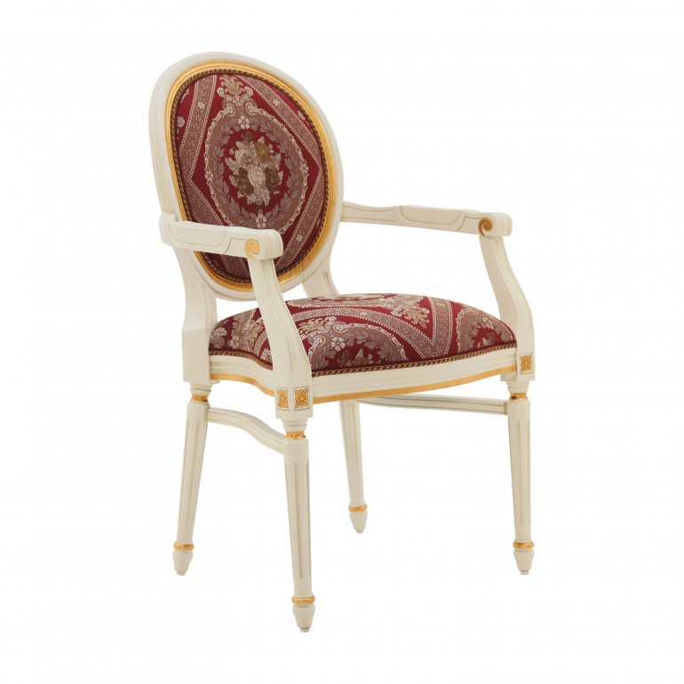 Comfortable Louis XVI style small armchair with beech wood structure. This model, together with many others we manufacture, is particularly suitable for the contract market as it features side rungs. The seat is padded with superior quality foam. The upholstery can be customized with nails, braiding, double welt or welt.