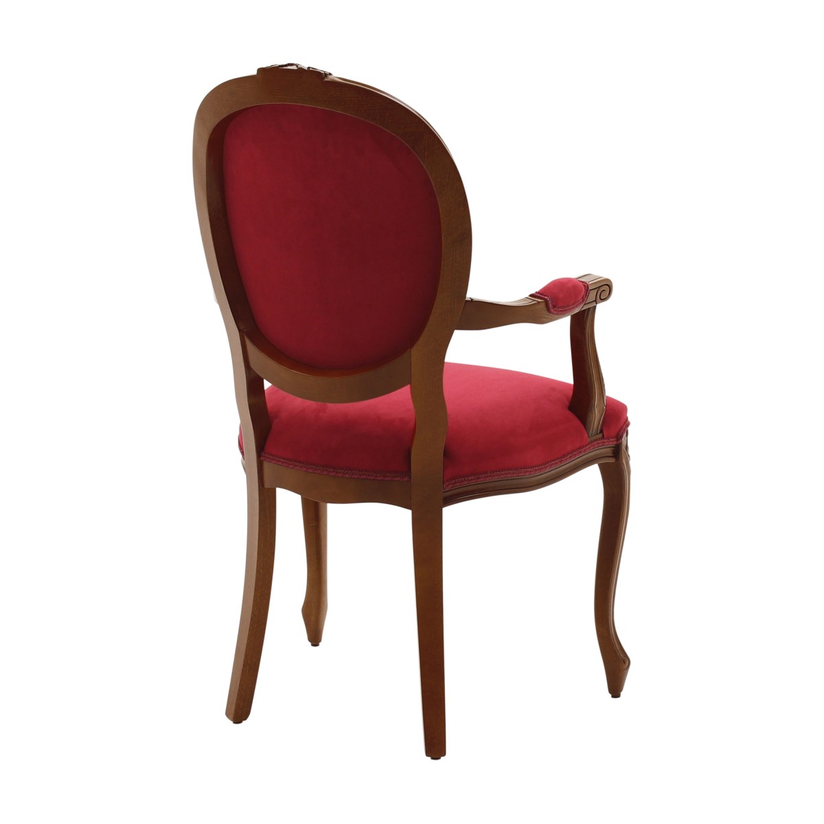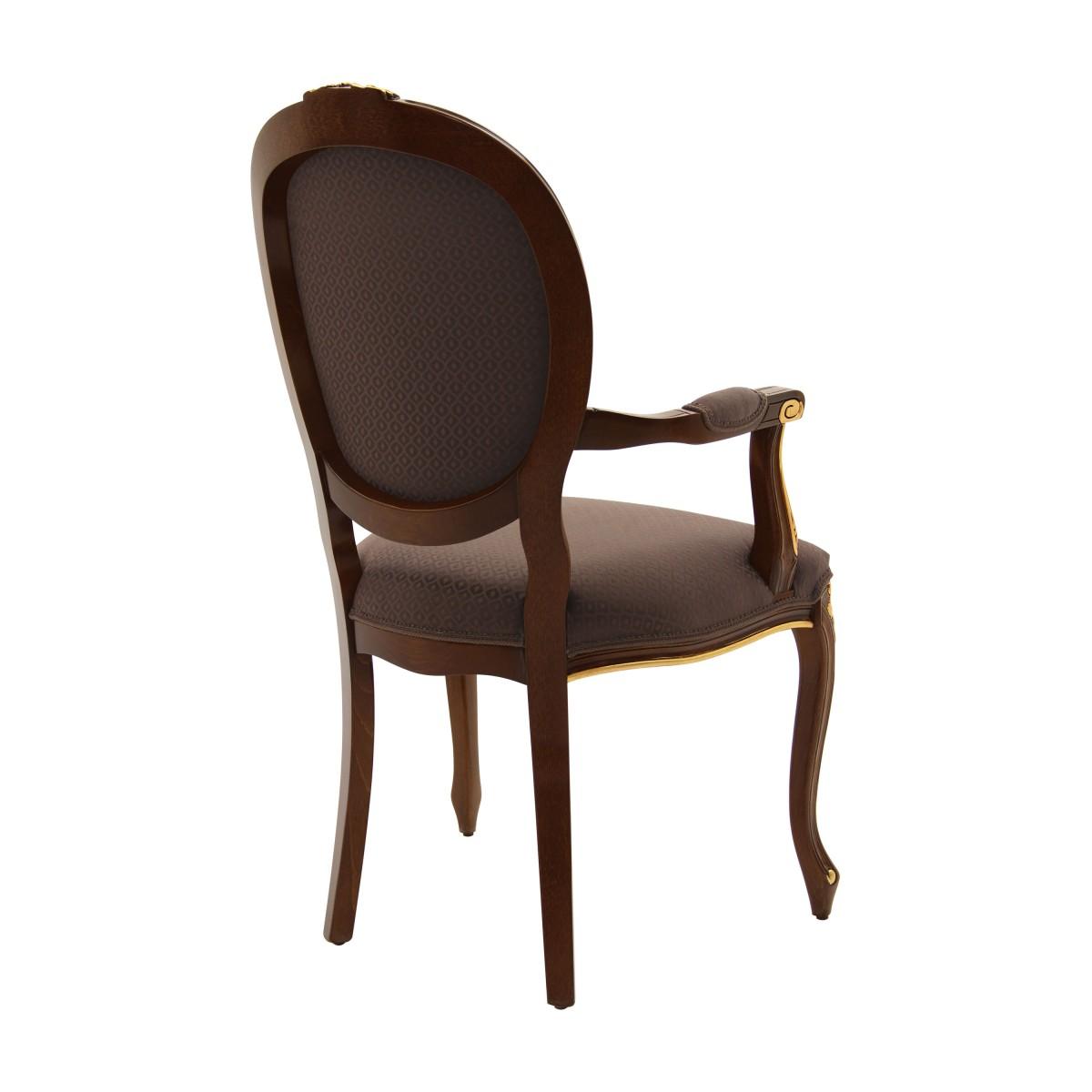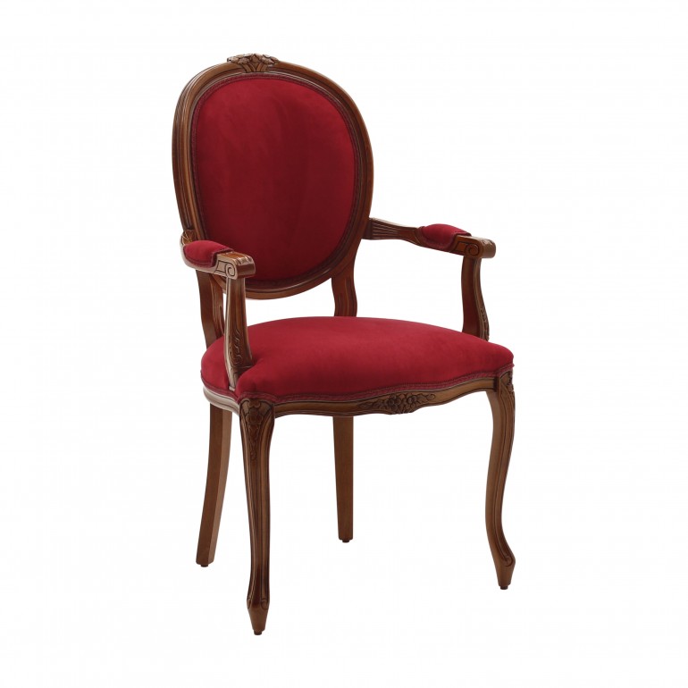 Comfortable classic style small armchair with beech wood structure. The carvings on the legs and back can be enhanced with a silver or gold leaf lacquer finish. The seat is padded with webbing, springs and superior quality foam. The upholstery can be customized with nails, braiding, double welt or welt.