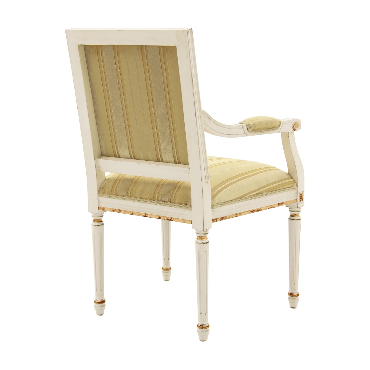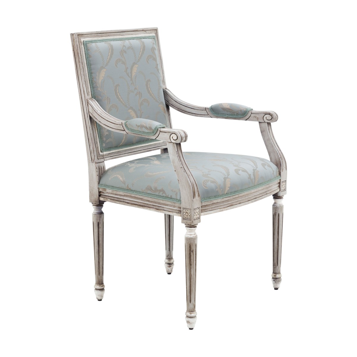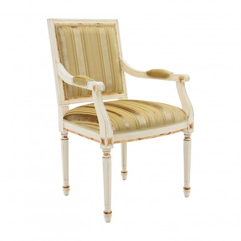 Comfortable Classic style small armchair with beech wood structure with lines reminiscent of the Louis XVI style. The carvings on the legs can be enhanced with a silver or gold leaf lacquer finish. The seat is padded with webbing, springs and superior quality foam. The upholstery can be customized with nails, braiding, double welt or welt.