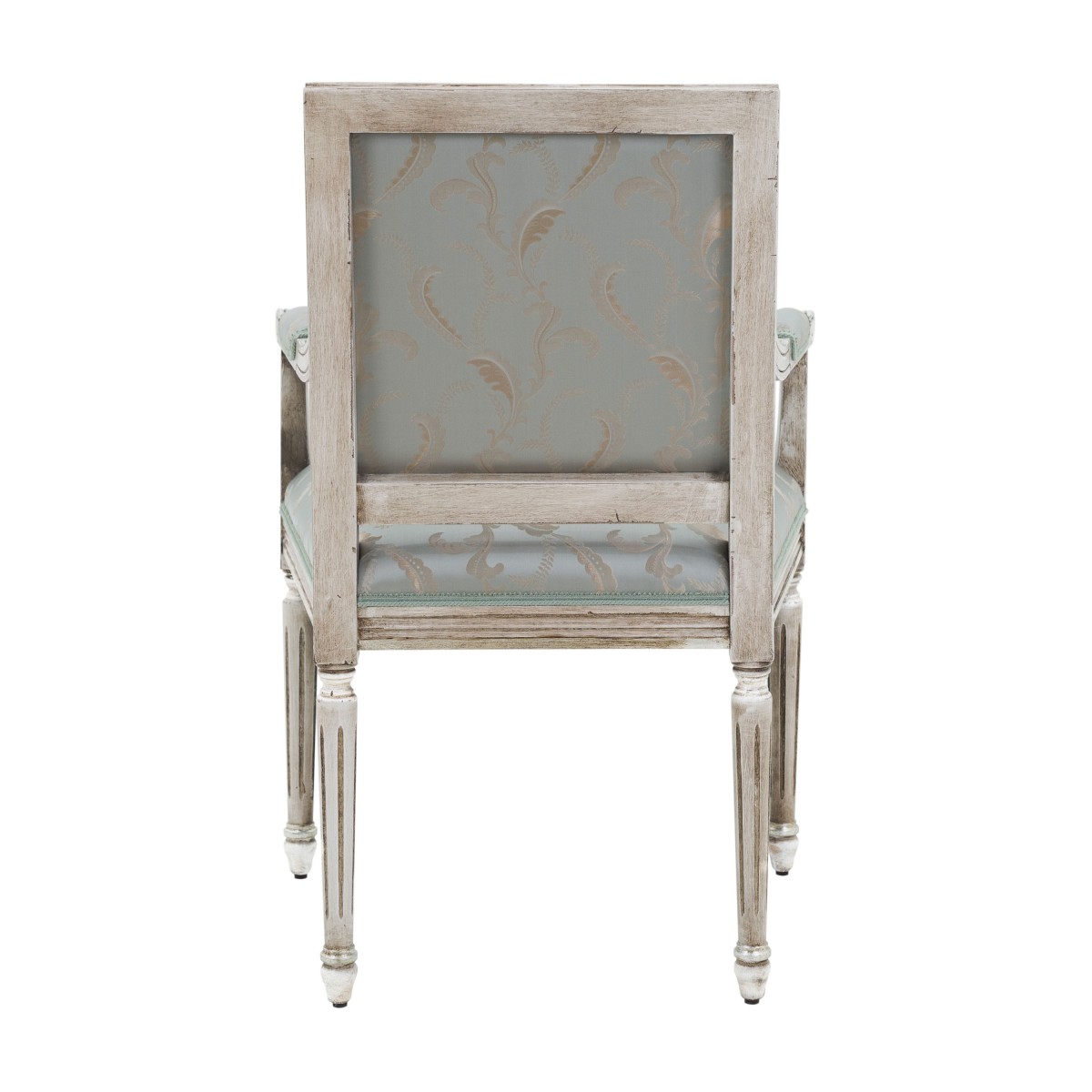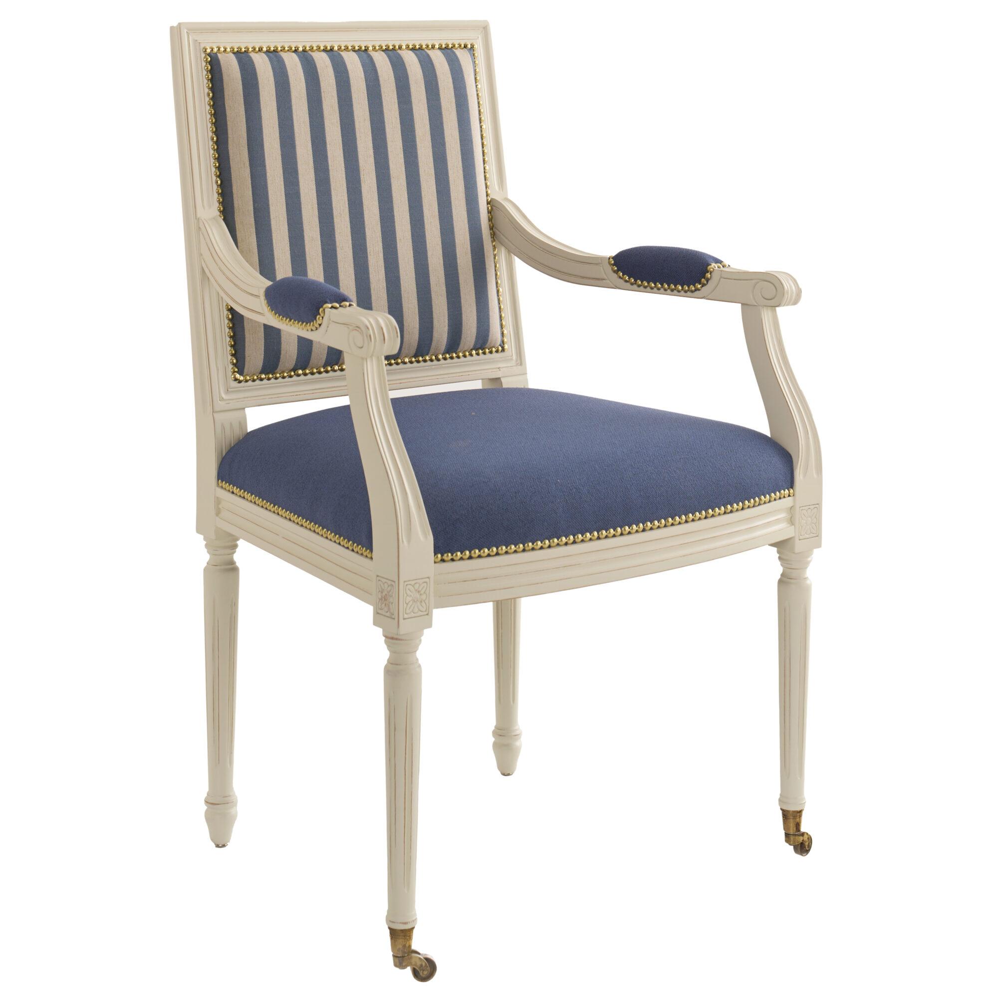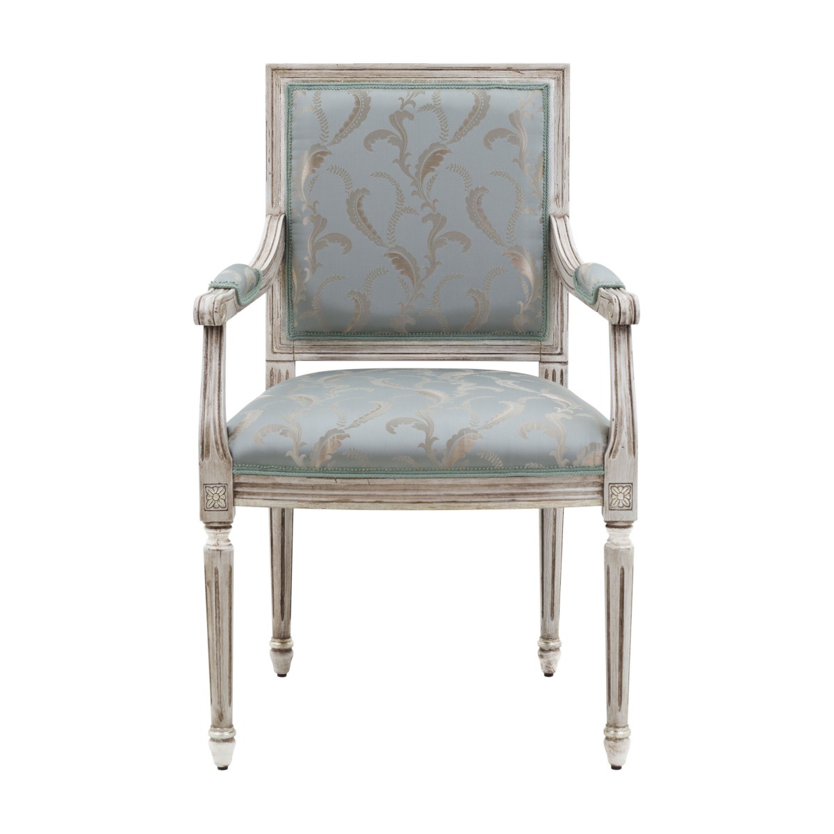 Comfortable Classic style small armchair with beech wood structure with lines reminiscent of the Louis XVI style. The carvings on the legs can be enhanced with a silver or gold leaf lacquer finish. The seat is padded with webbing, springs and superior quality foam. The upholstery can be customized with nails, braiding, double welt or welt.