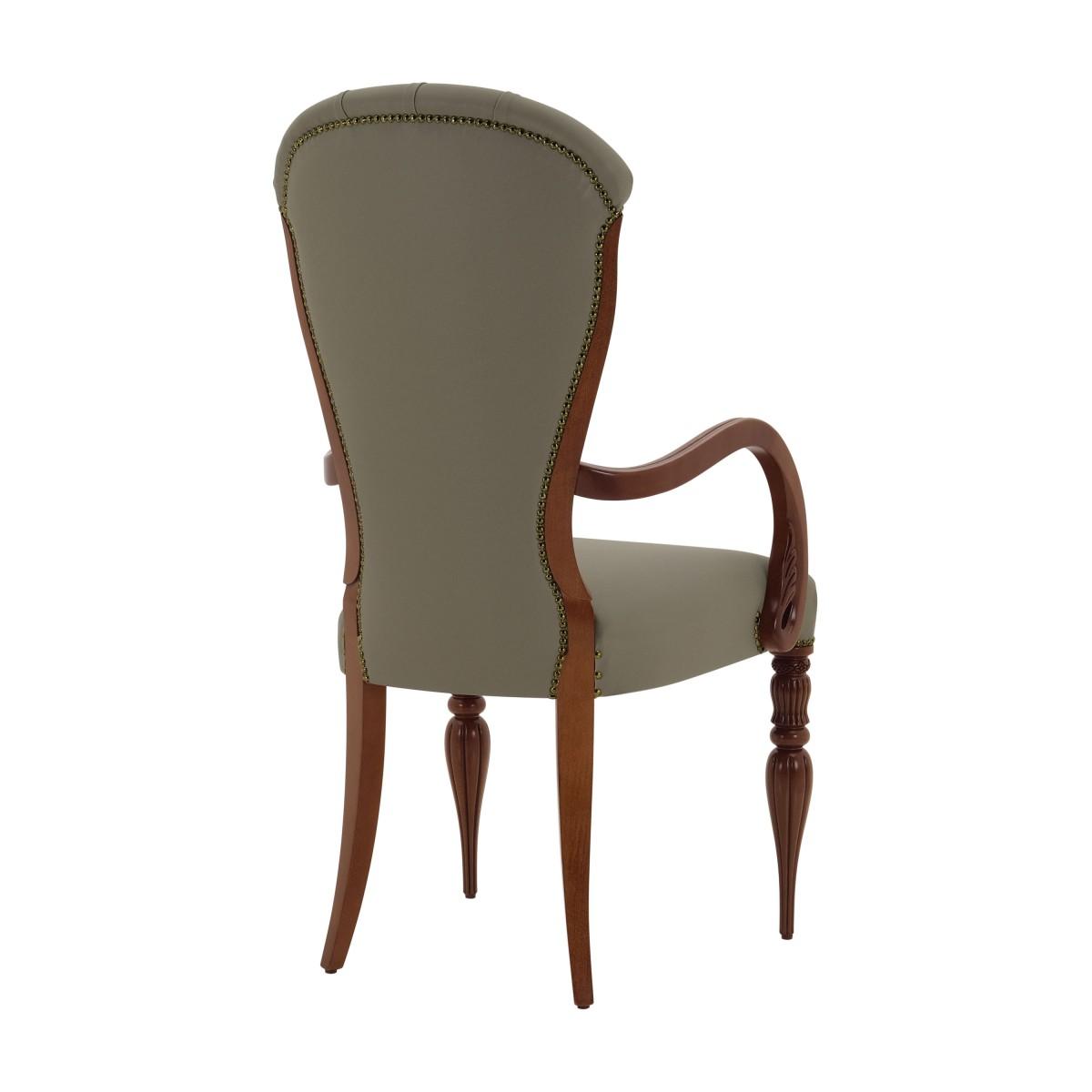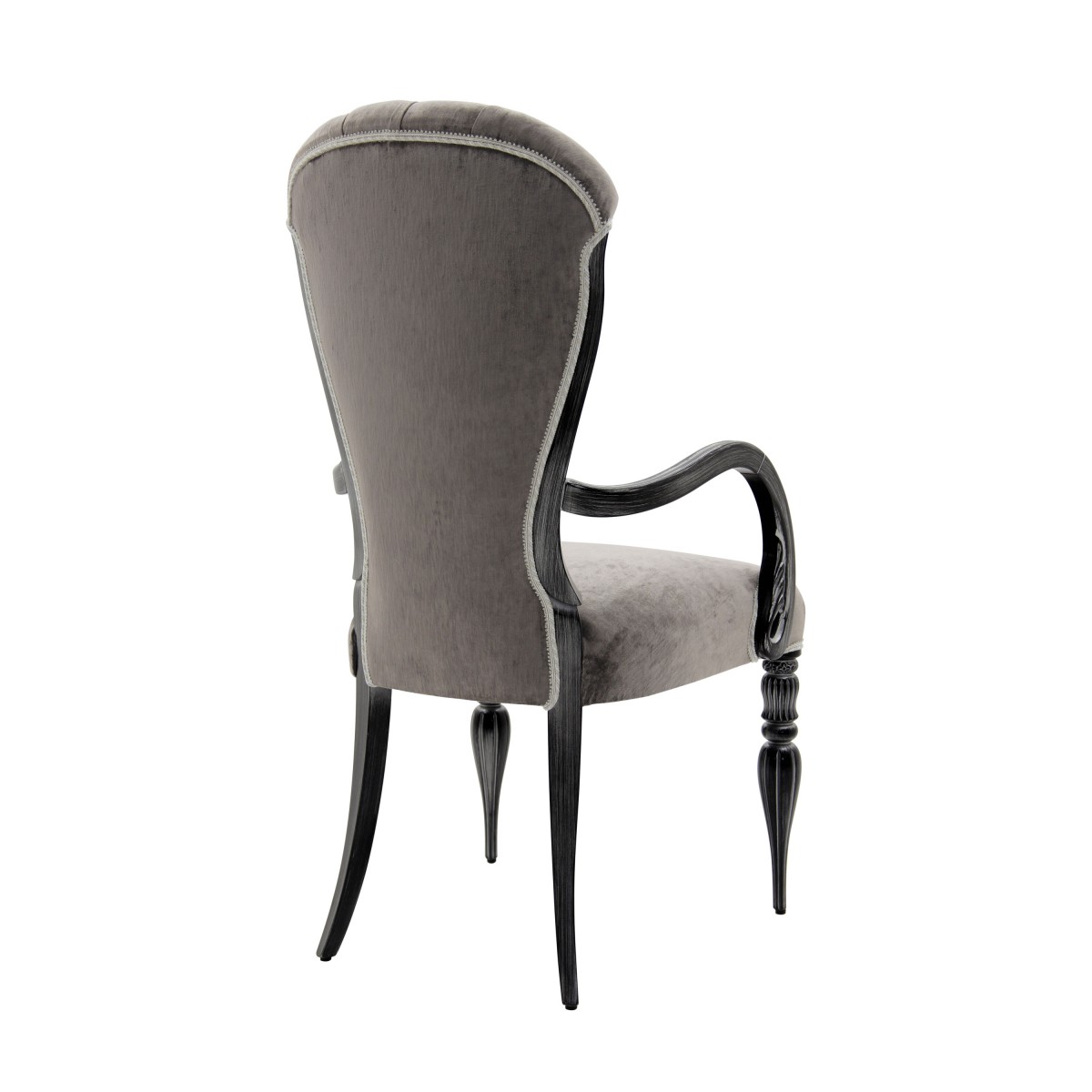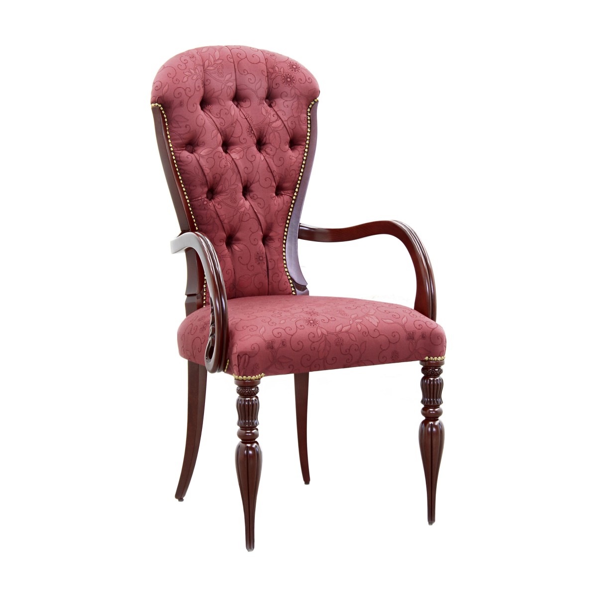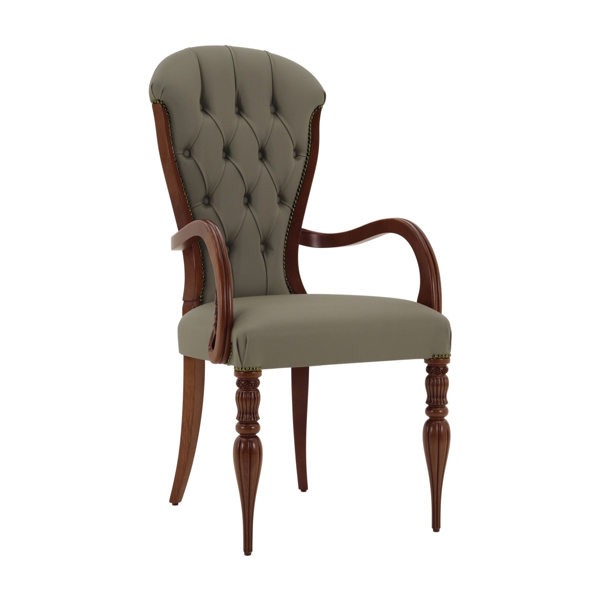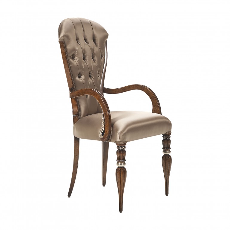Classic style small armchair with beech wood structure featuring original and sinuous lines. The seat is padded with non-elastic webbing, three springs and superior quality foam. The upholstery can be customized with nails, braiding, double welt or welt. The deep-buttoned upholstery is a standard feature and particularly enhances the luxuriousness of this model.