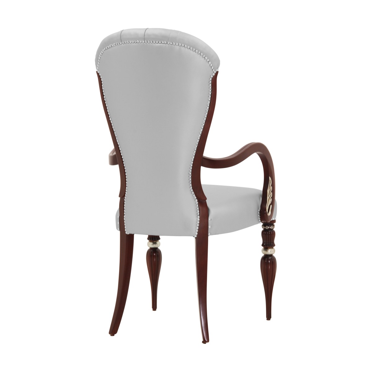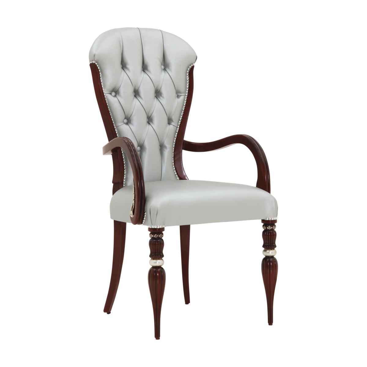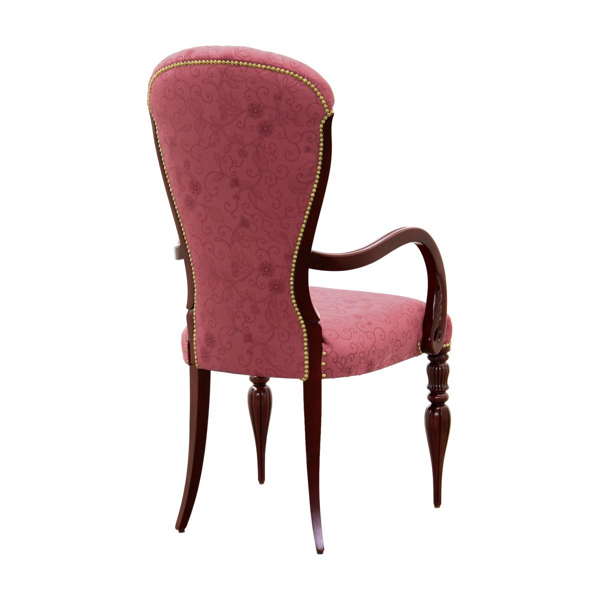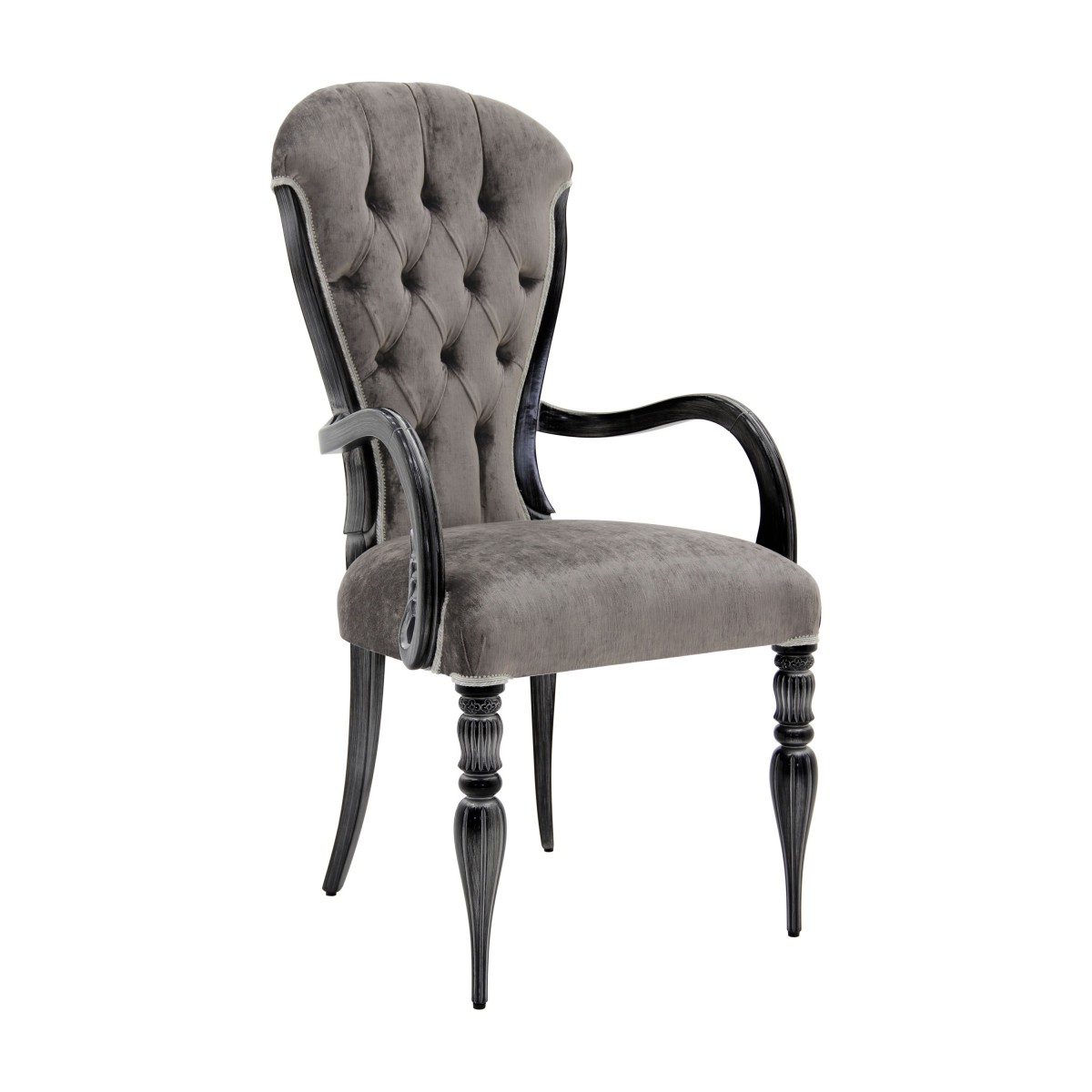 Classic style small armchair with beech wood structure featuring original and sinuous lines. The seat is padded with non-elastic webbing, three springs and superior quality foam. The upholstery can be customized with nails, braiding, double welt or welt. The deep-buttoned upholstery is a standard feature and particularly enhances the luxuriousness of this model.