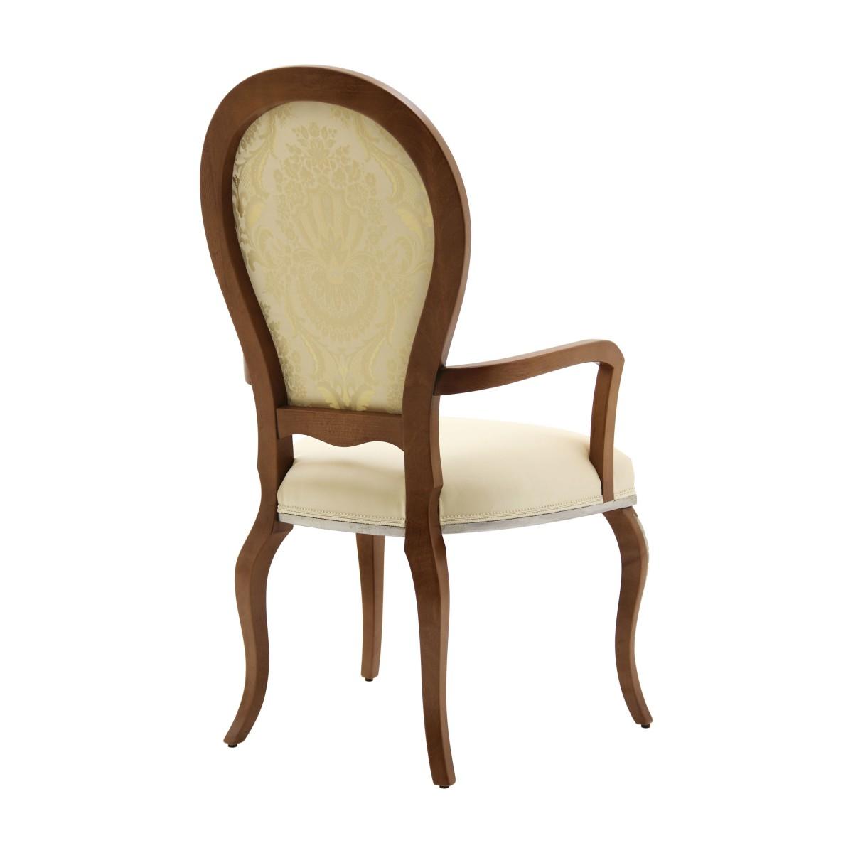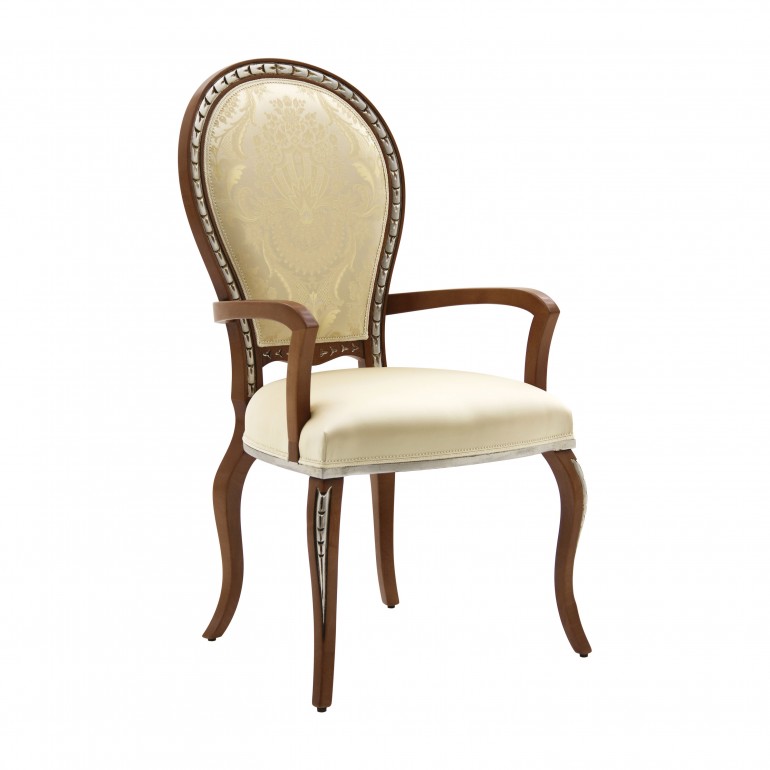 Classic style small armchair with beech wood structure with simple and sinuous lines. It features carvings on the front and rear of the back and on the front legs, which can be enhanced with a silver or gold leaf lacquer finish. The seat is padded with webbing, three springs and superior quality foam. The upholstery can be customized with nails, braiding, double welt or welt.