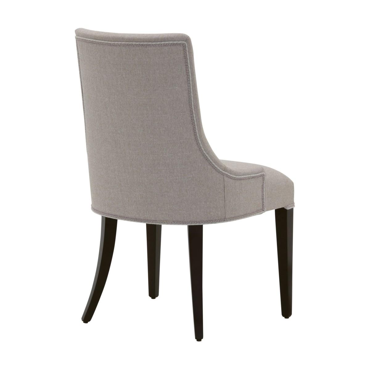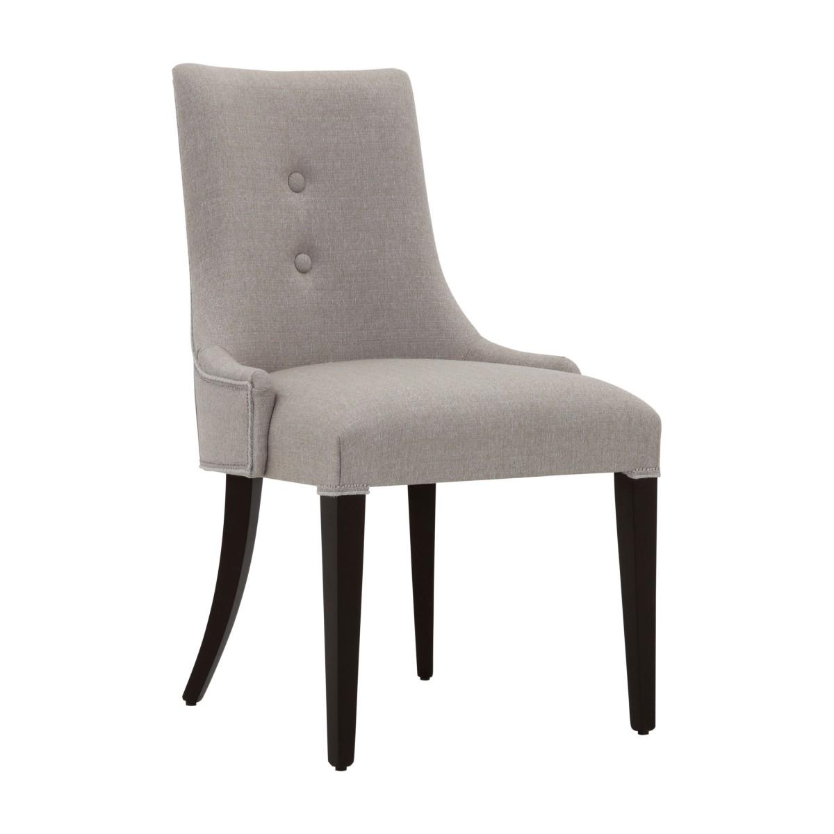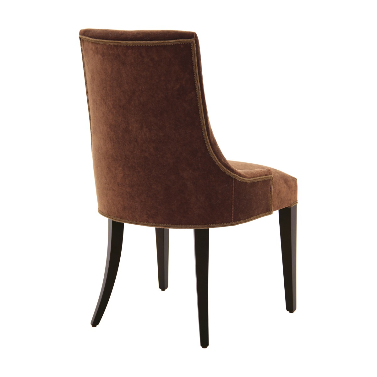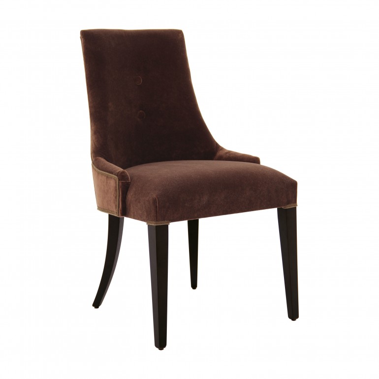 Comfortable modern style chair with beech wood structure, simple and captivating lines, featuring a cocooning back decorated with two buttons. The seat is padded with webbing and superior quality foam. The upholstery can be customised with nails, braiding, double welt or welt.