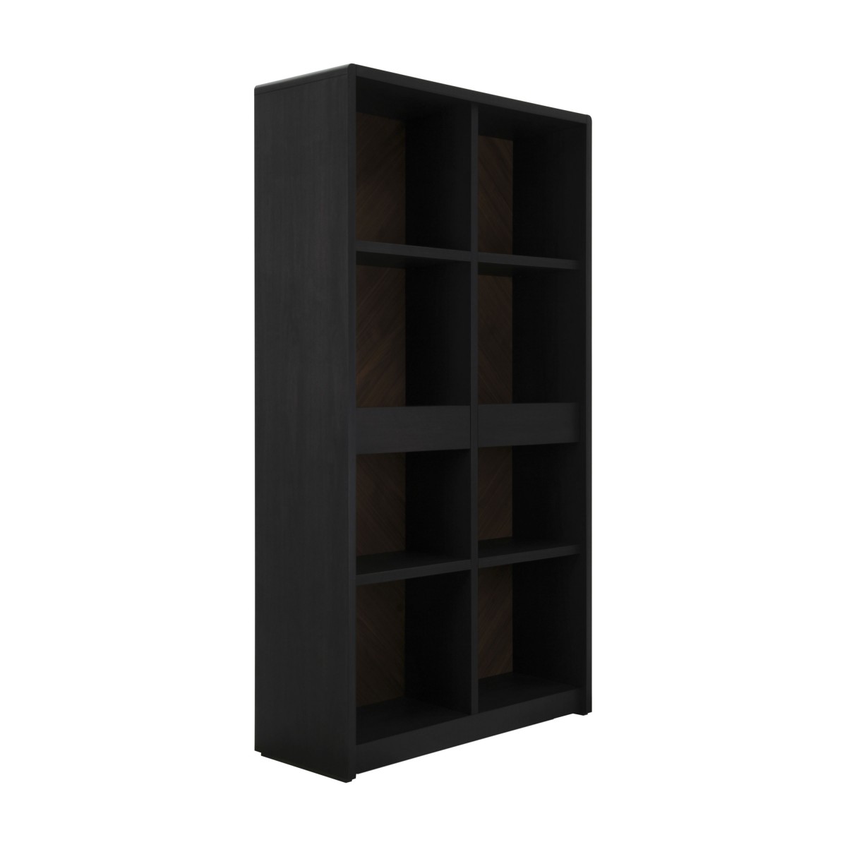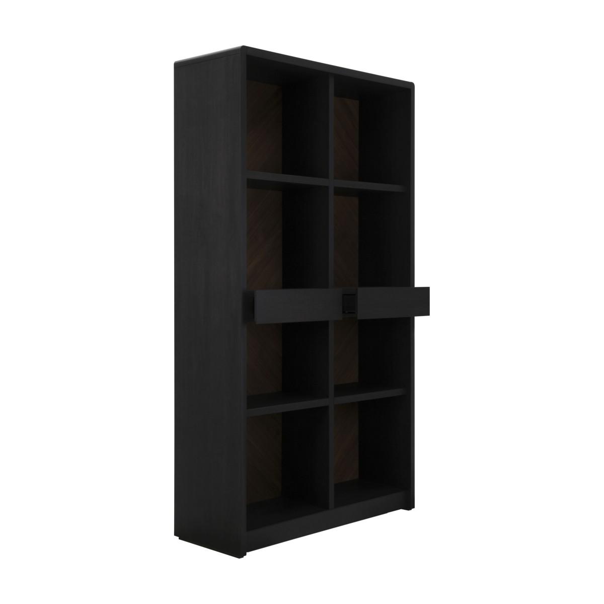 MOON is a modern Italian bookcase with wooden structure, an open shelves bookcase with two drawers. It is the perfect solution for an exclusive modern office or for a livingroom. Moon bookcase is veneered in natural Ash wood, polished in a beautiful anthracite finish which enhances the natural grains of the wood. The walnut back panel, with an exclusive rombus design, is polished in walnut color to enlight the beauty of the natural wood. Design and manufacturing are done entirely in Italy.