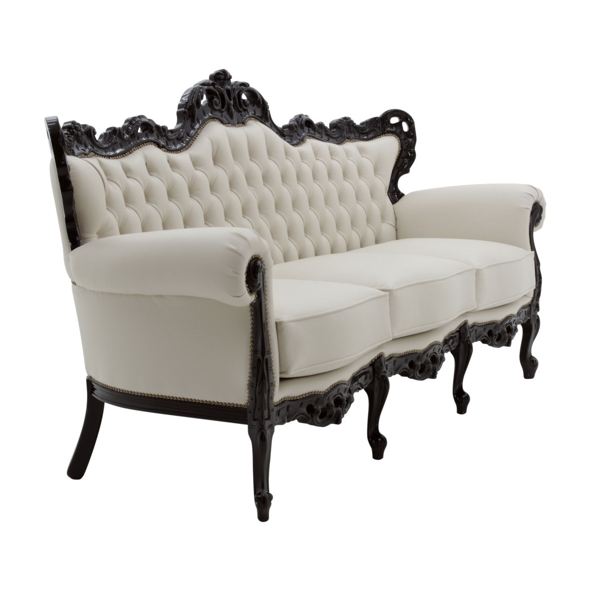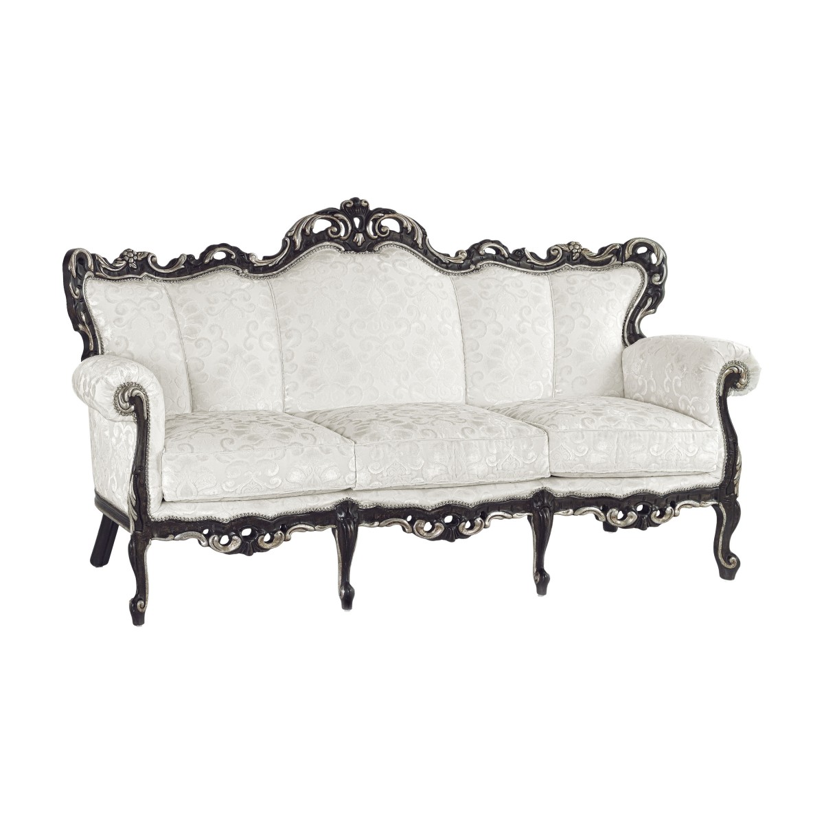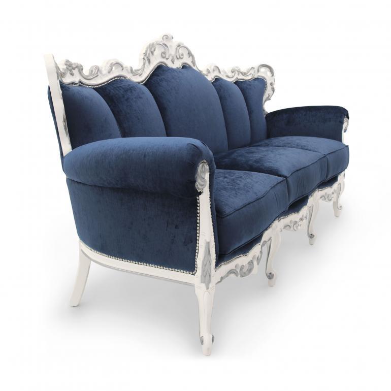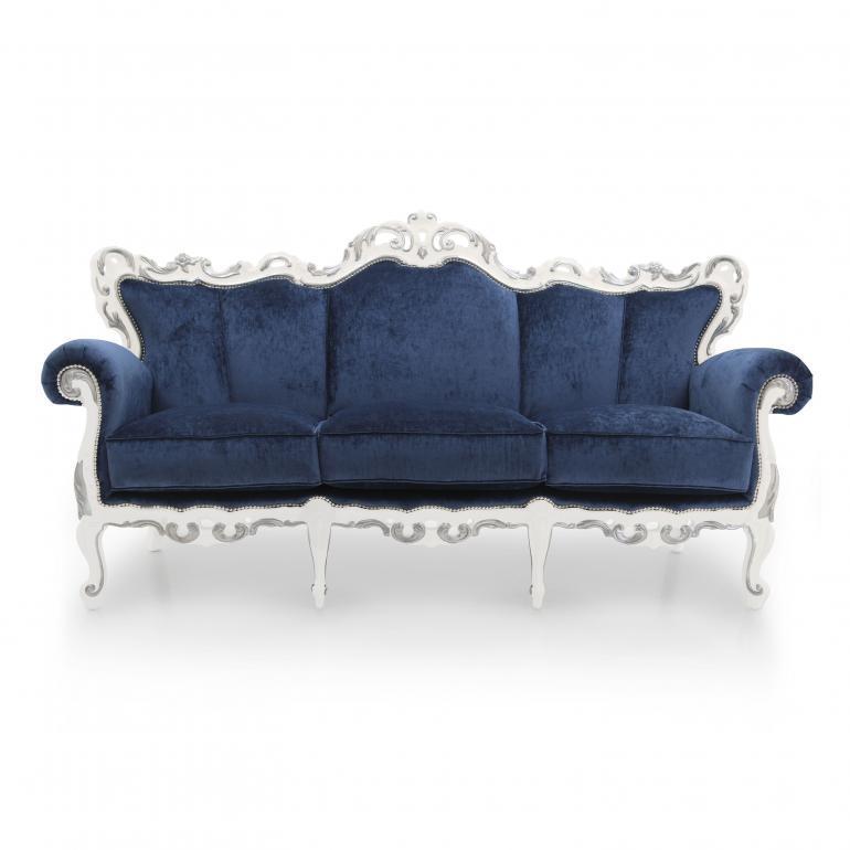 Baroque style three seat sofa with beech wood structure enriched with carvings that can be enhanced with a gold or silver leaf lacquer finish. The seat features three cushions and is padded with webbing and superior quality foam. The upholstery can be customized with nails, braiding, double welt or welt.