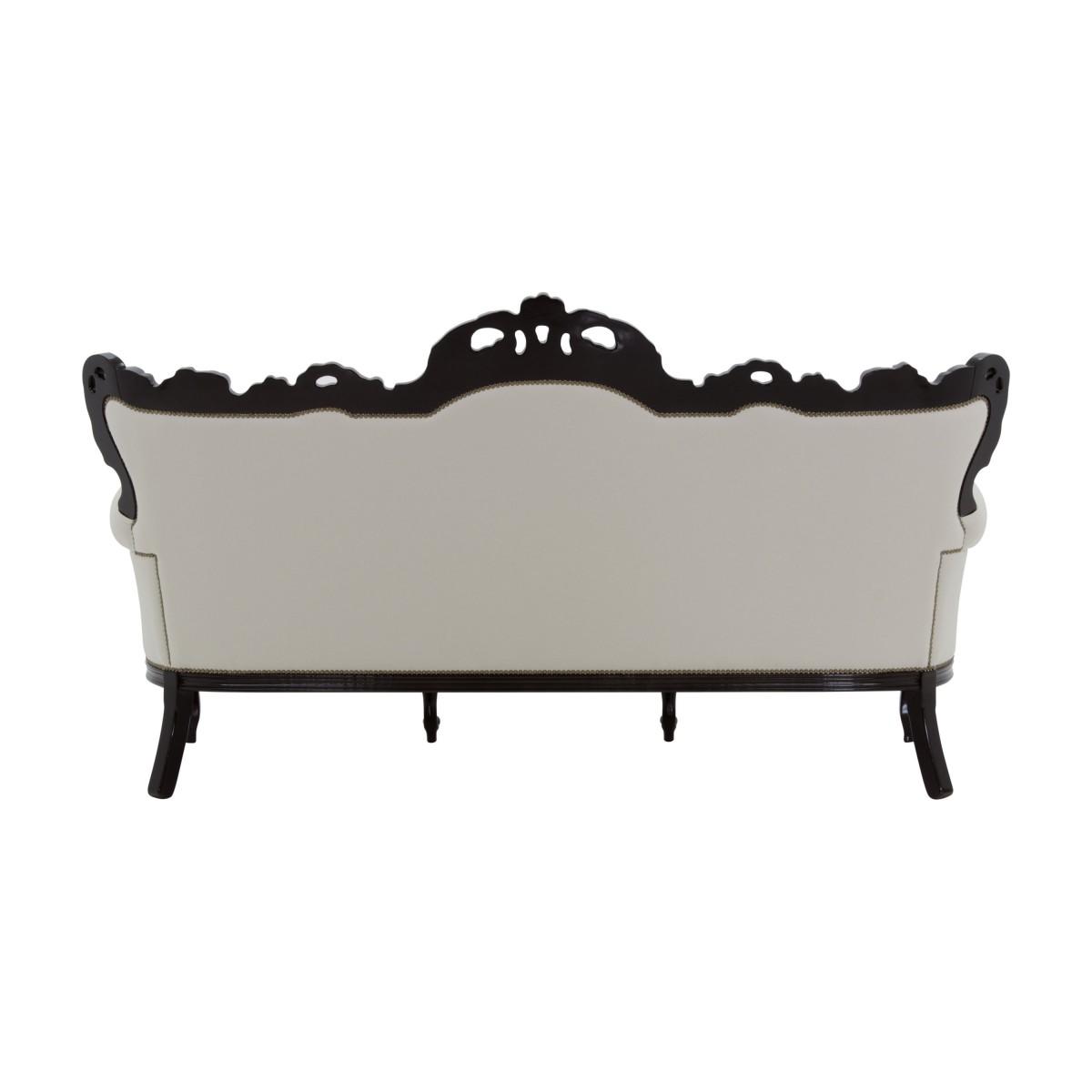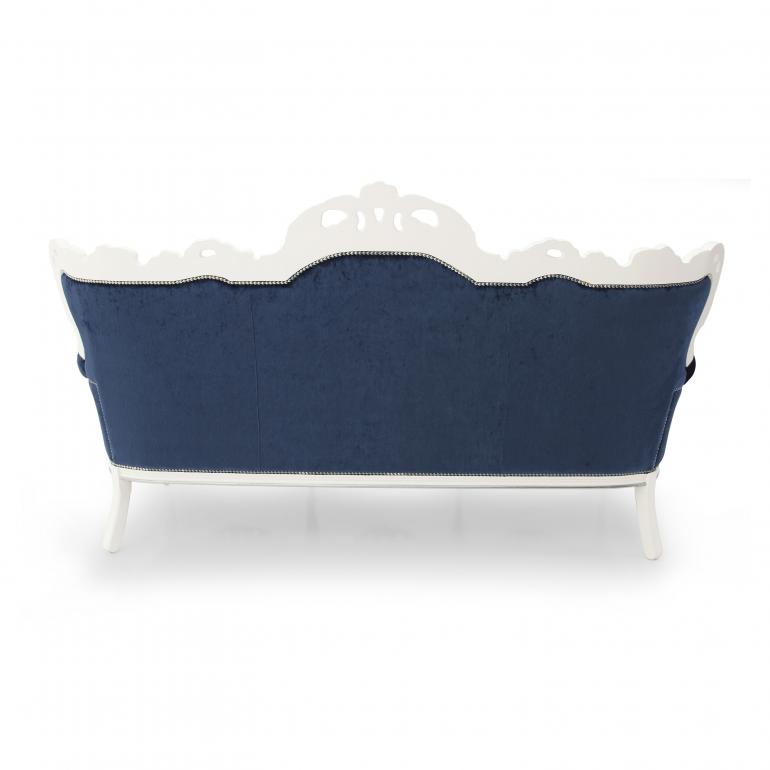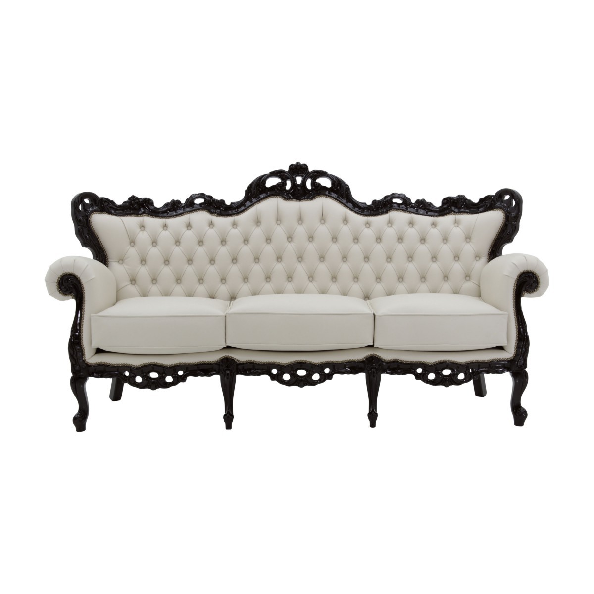 Baroque style three seat sofa with beech wood structure enriched with carvings that can be enhanced with a gold or silver leaf lacquer finish. The seat features three cushions and is padded with webbing and superior quality foam. The upholstery can be customized with nails, braiding, double welt or welt.