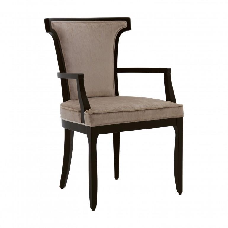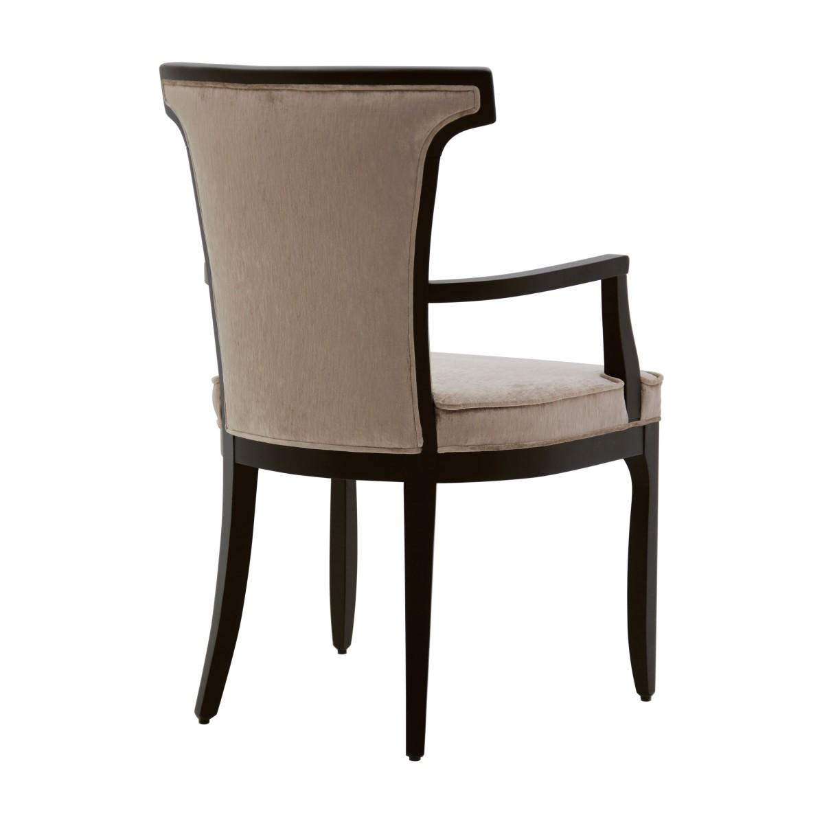 Elegant Contemporary style beech wood small armchair with very simple and essential lines. The seat is padded with webbing, springs and superior quality foam. The upholstery is trimmed with matching or contrasting piping.