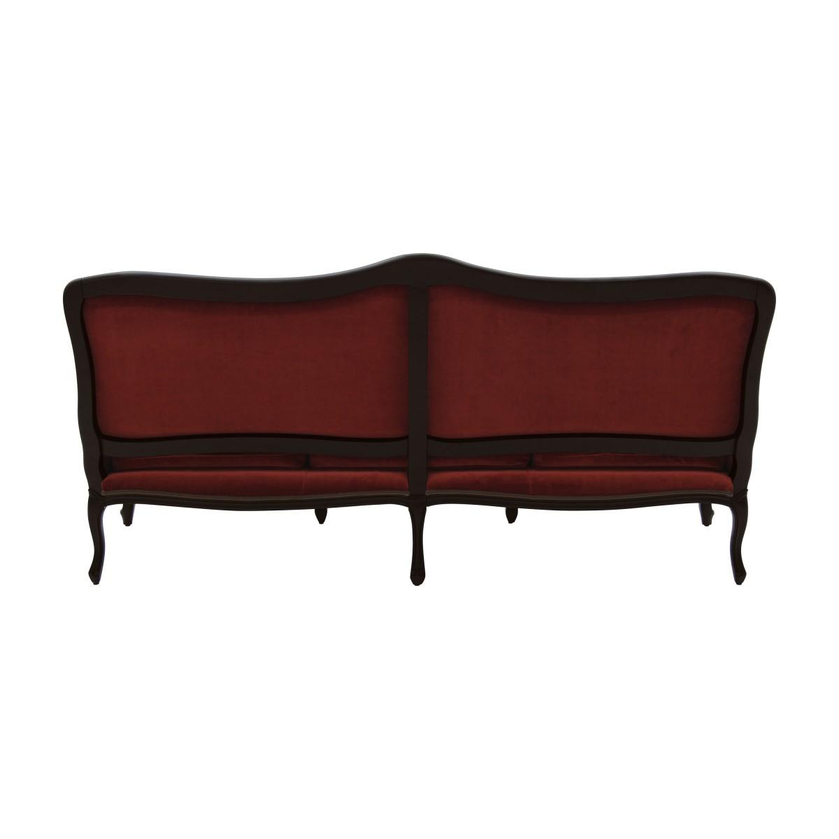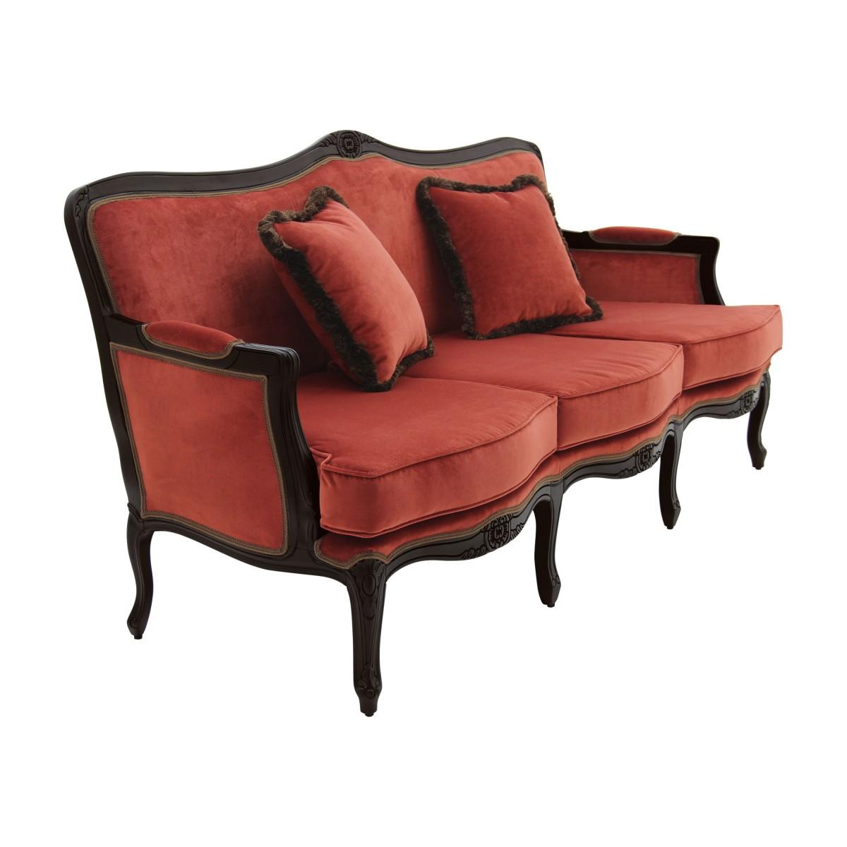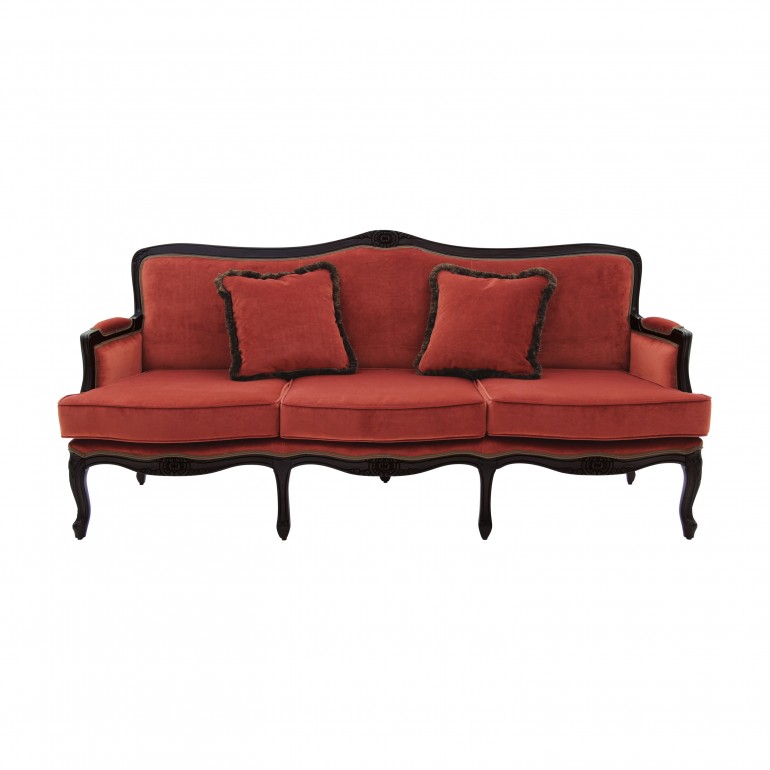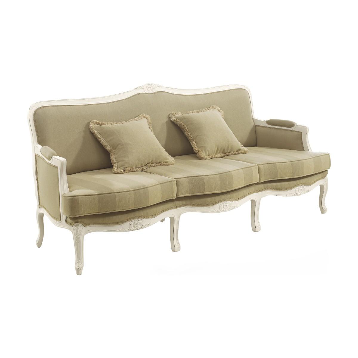 Comfortable Classic style three seat sofa with beech wood structure. The sofa is upholstered with webbing and superior quality foam and has three comfortable padded seat cushions. The upholstery can be customized with nails, braiding, double welt or welt.