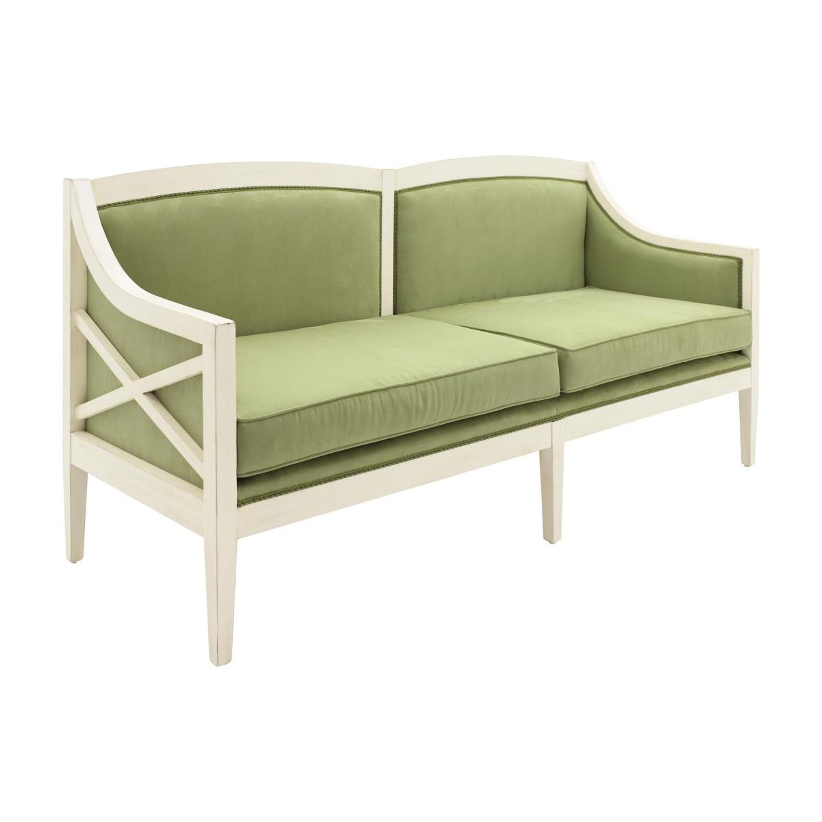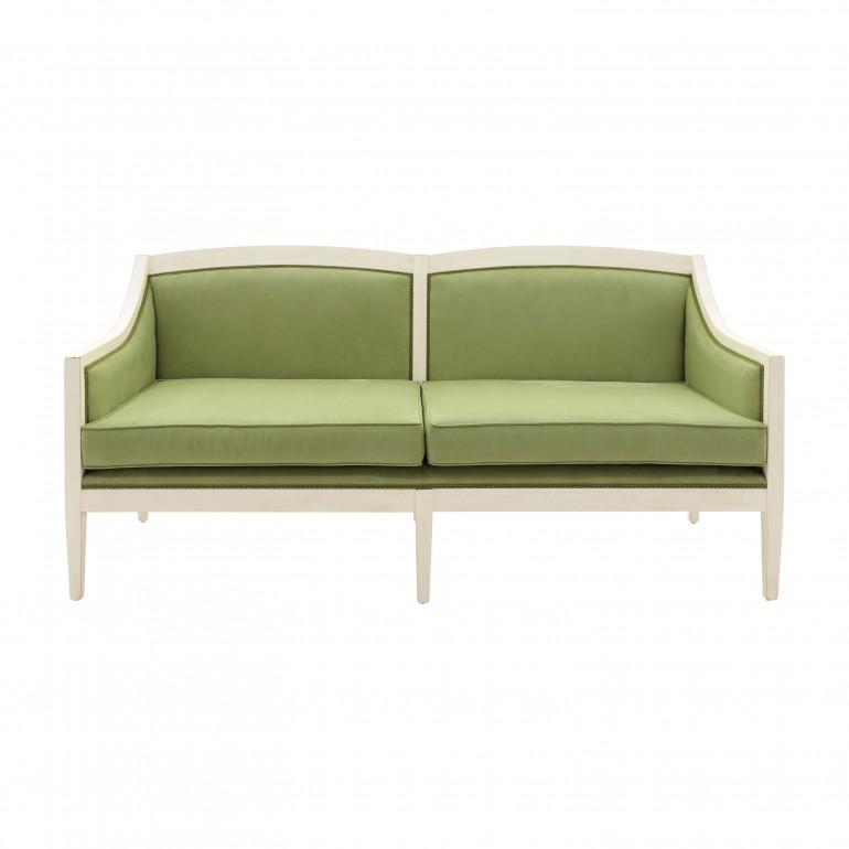 Comfortable Art deco style three seat sofa with beech wood structure. The sofa is upholstered with webbing and superior quality foam and has two comfortable padded seat cushions. The upholstery can be customized with nails, braiding, double welt or welt.