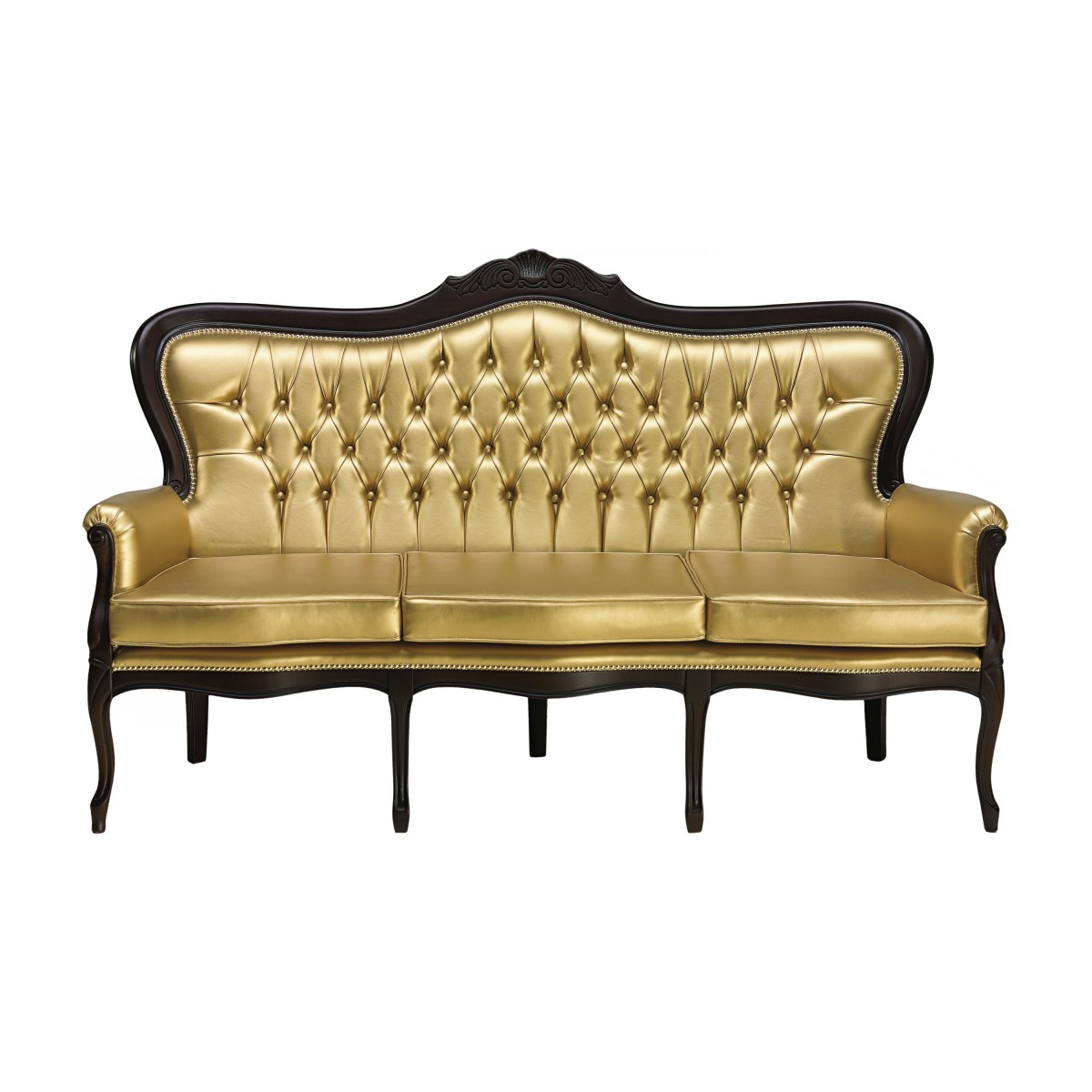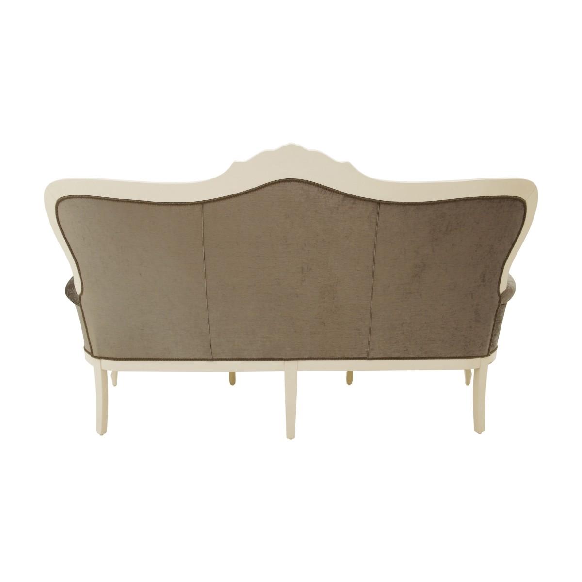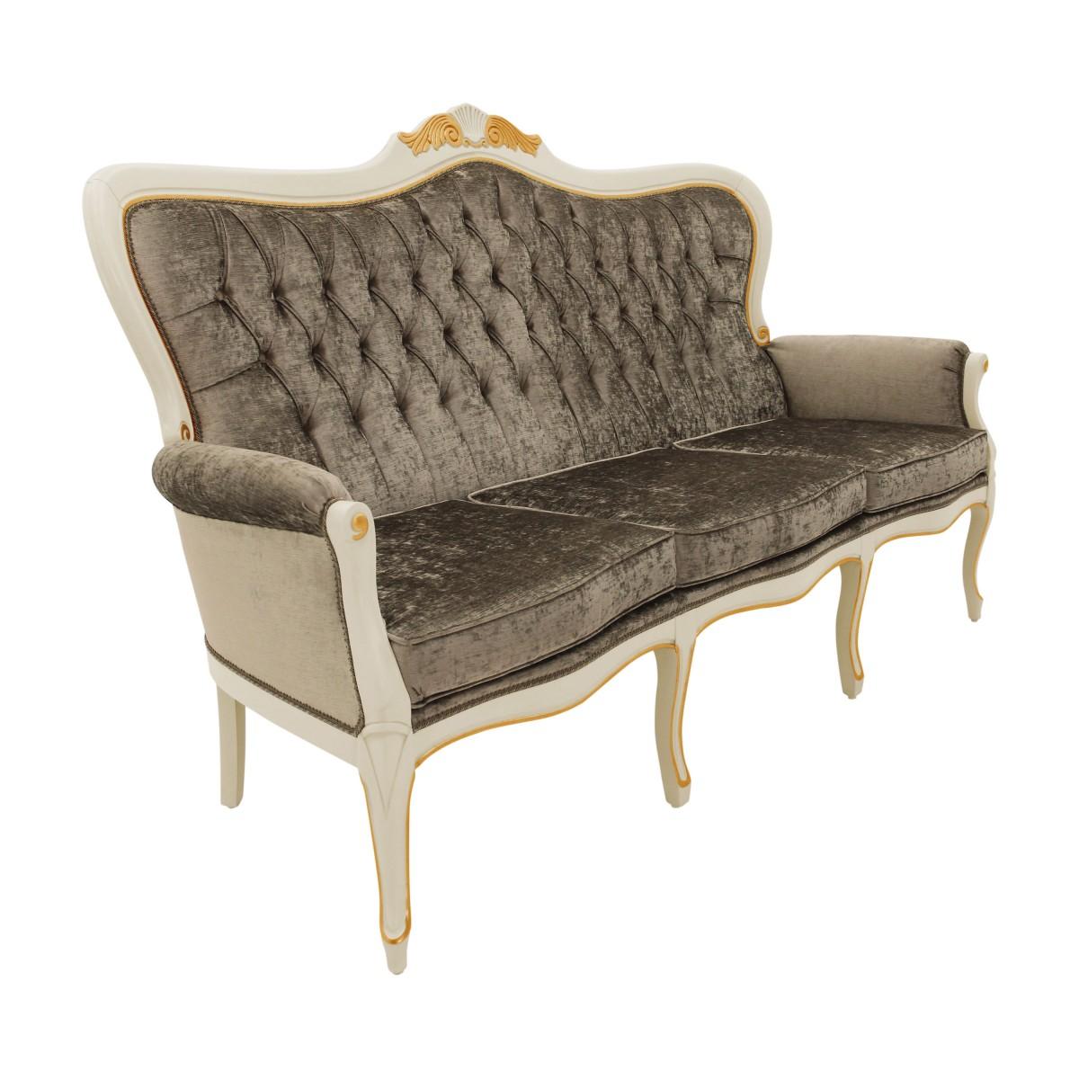 Comfortable Louis Philippe style three seat sofa with beech wood structure.The sofa is upholstered with webbing and superior quality foam and has three comfortable padded seat cushions. The upholstery can be customised with nails, braiding, double welt or welt.