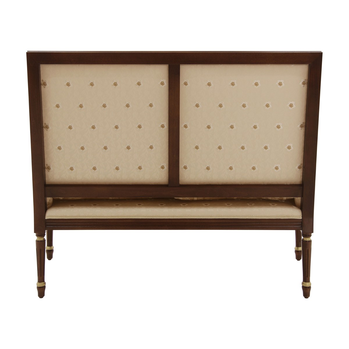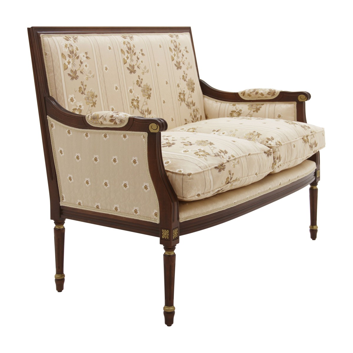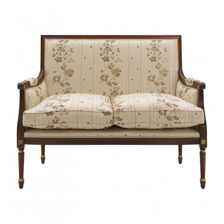 Elegant Louis XVI style two seat sofa with beech wood structure. The sofa is upholstered with webbing and superior quality foam and has two comfortable padded seat cushions. The upholstery can be customized with nails, braiding, double welt or welt.