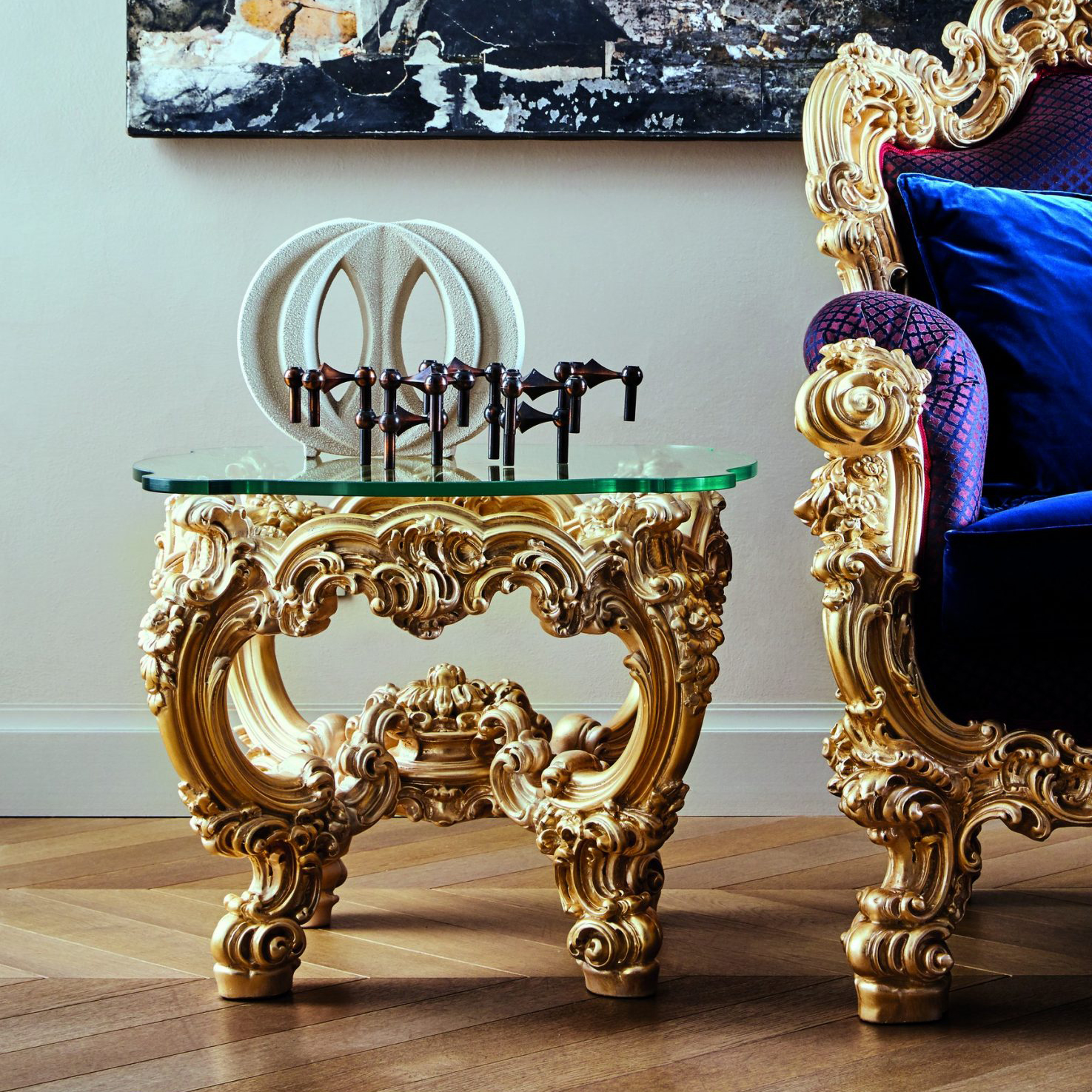 Orpheus square coffee table, crystal top; 26.4″ x 26.4″ x 21.25″ h.