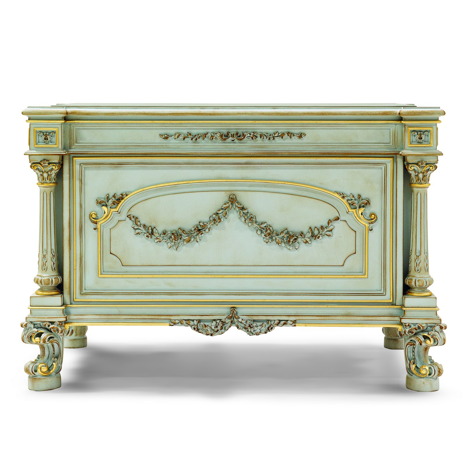 Writing desk with 4 drawers, top covered in leather with gilt engravings; 44.5″ w. x 26″ d. x 29.5″ h.