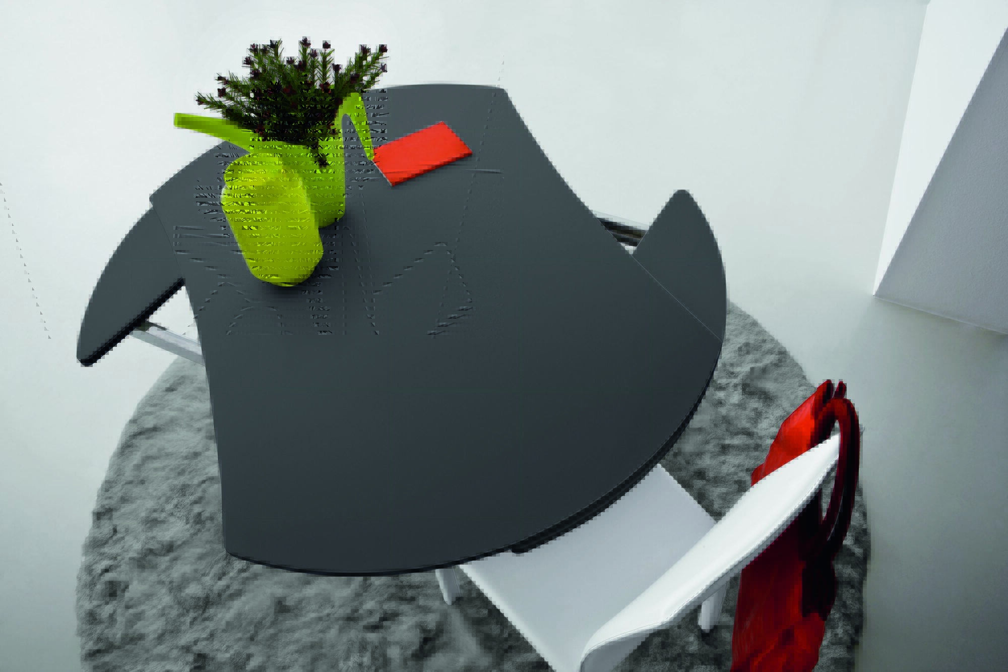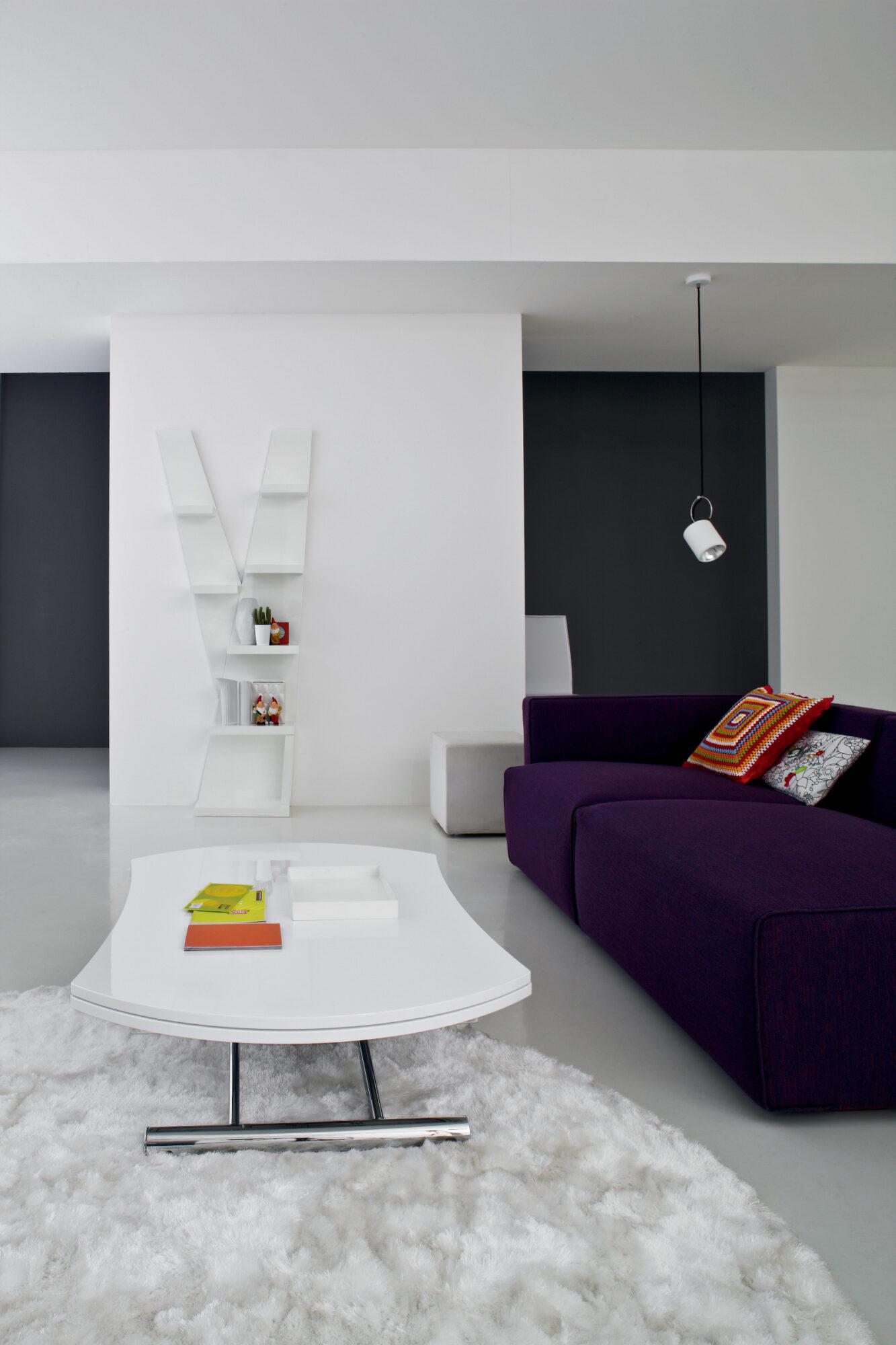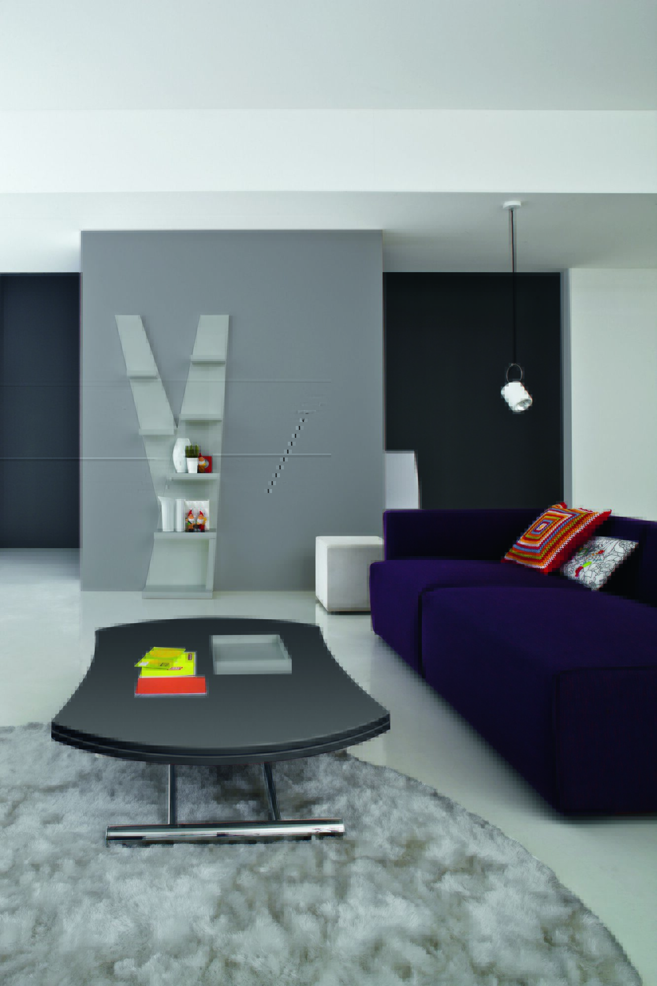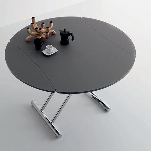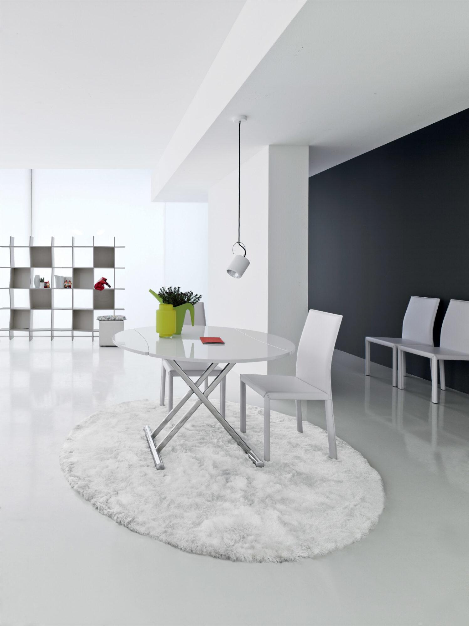 Liftable table and adjustable by a pump with chromed or mat sand frame. Rectangular special shape top convertible in round, in bright white or dove grey lacquered mdf, in canaletto walnut wood veneered or in mat beige, white or ash grey extraclear lacquered safety glass.
