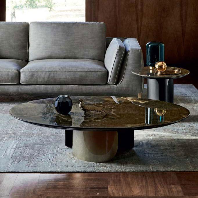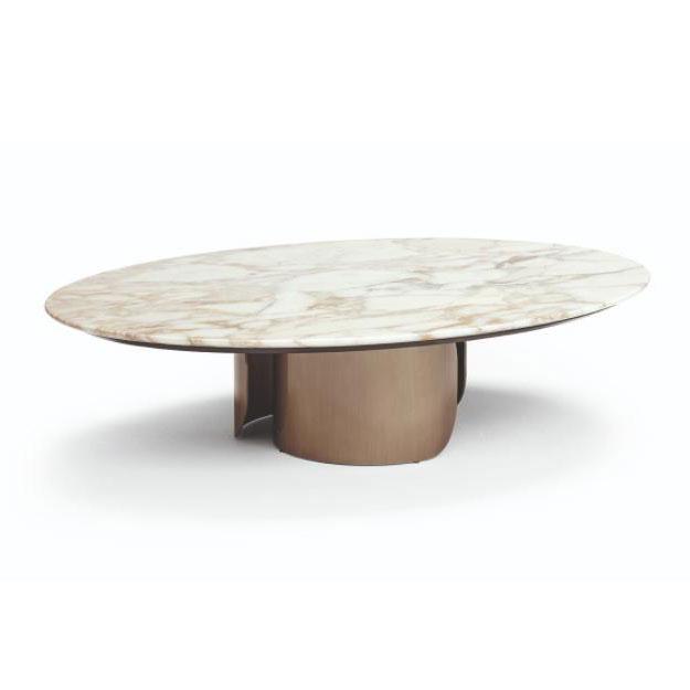 The oval-topped Gabriel small table boasts minimalist lines and a contemporary feel. With its metal base and marble top, it boldly contrasts textures and materials. The cylindrical structure, with its curved corners, are open at the side to reveal their hollow interior.