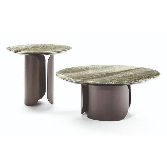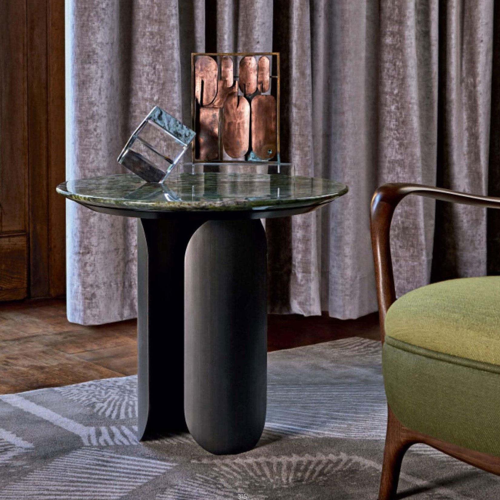 The round-topped Gabriel small table boasts minimalist lines and a contemporary feel. With its metal base and marble top, it boldly contrasts textures and materials. The cylindrical structure, with its curved corners, are open at the side to reveal their hollow interior.