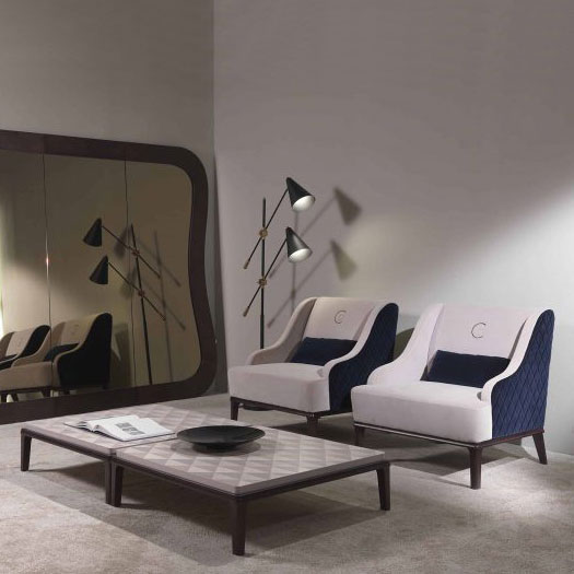 System of sofas and armchair with wooden structure covered with a layer of polyurethane. The maximum comfort of the seat is determined by an intertwining of elastic straps. Wooden feet in dark Sycamore finish (F123). Upholstery available in fabric or leather. The covering of the external shell is characterized by a diamond-quilted workmanship.