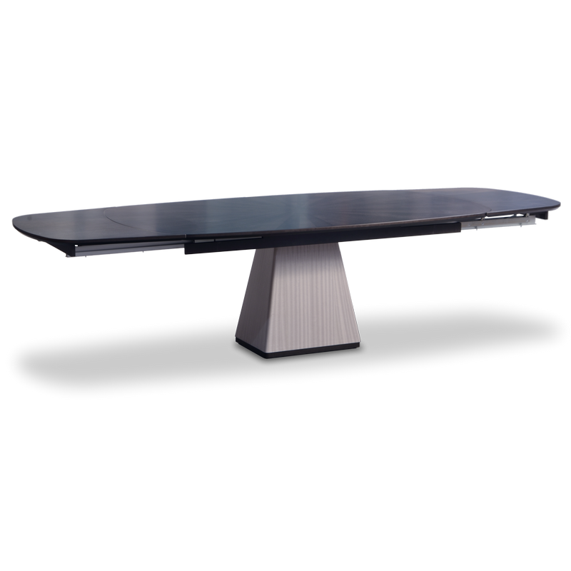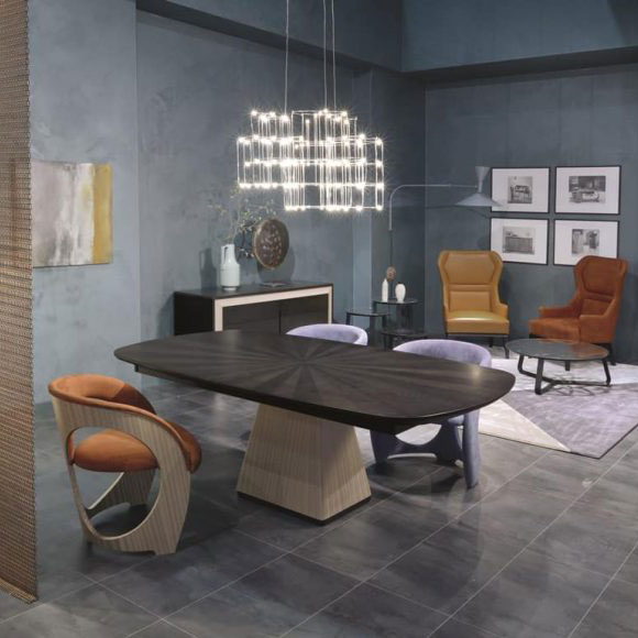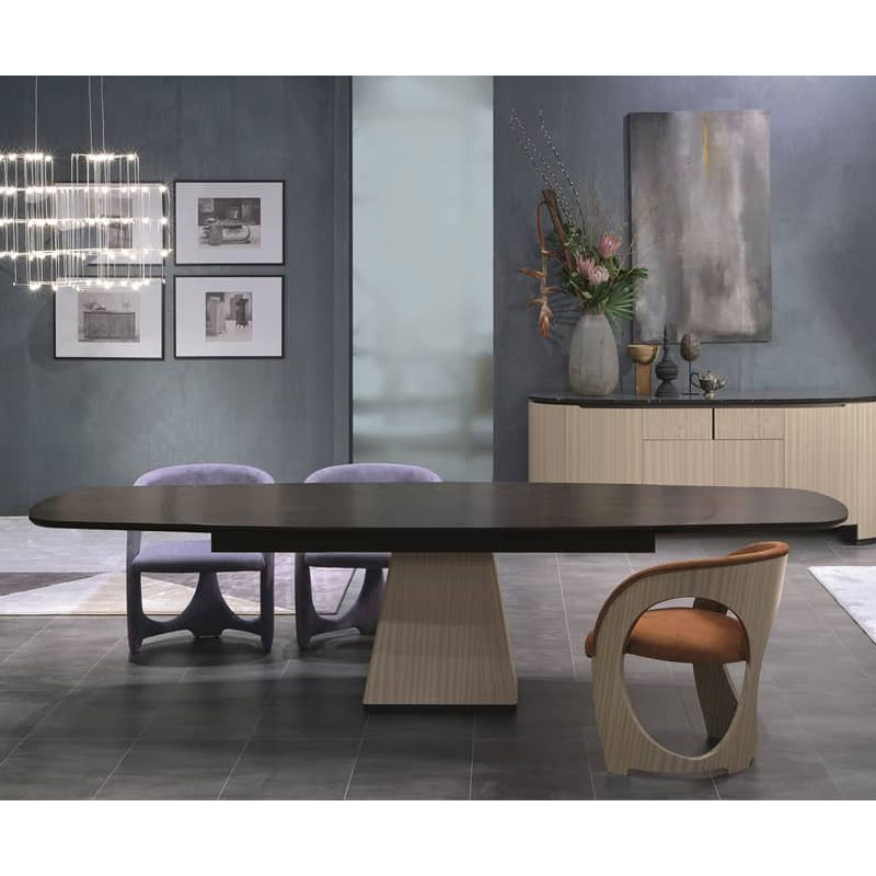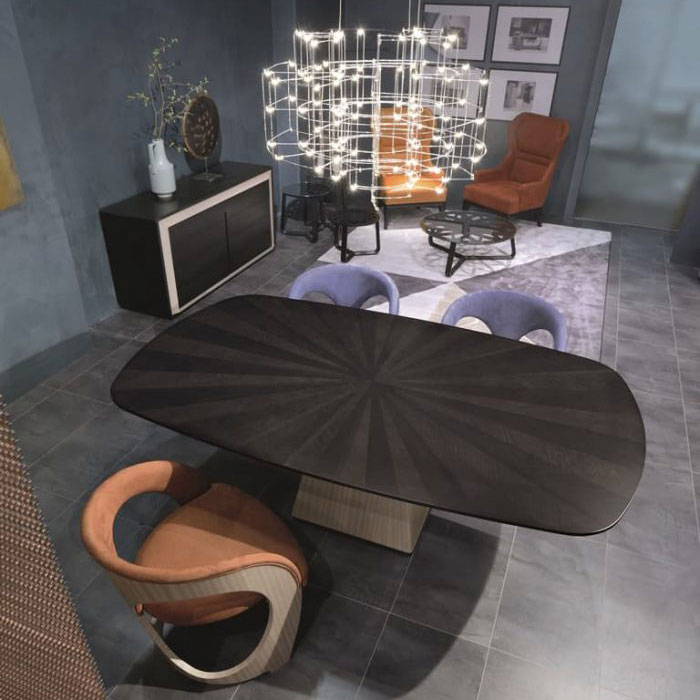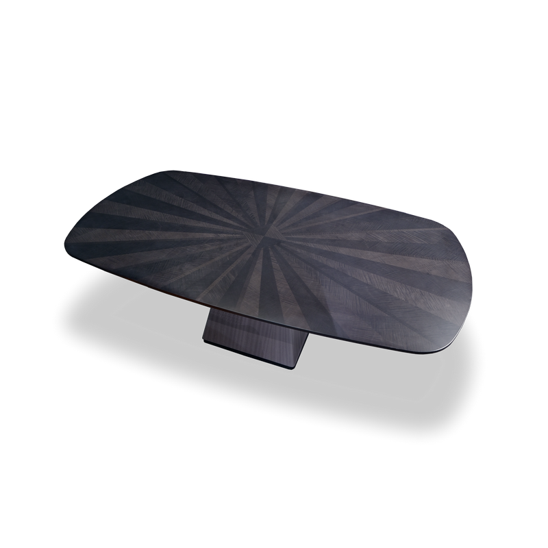 Table with dark frisè Sycamore top, geometric inlay. Pama base. Available with fixed top measuring 210 cm (TA69) 310 cm (TA69KS), extendable (TA69K) and with top in black Marquinho marble (TA69B).