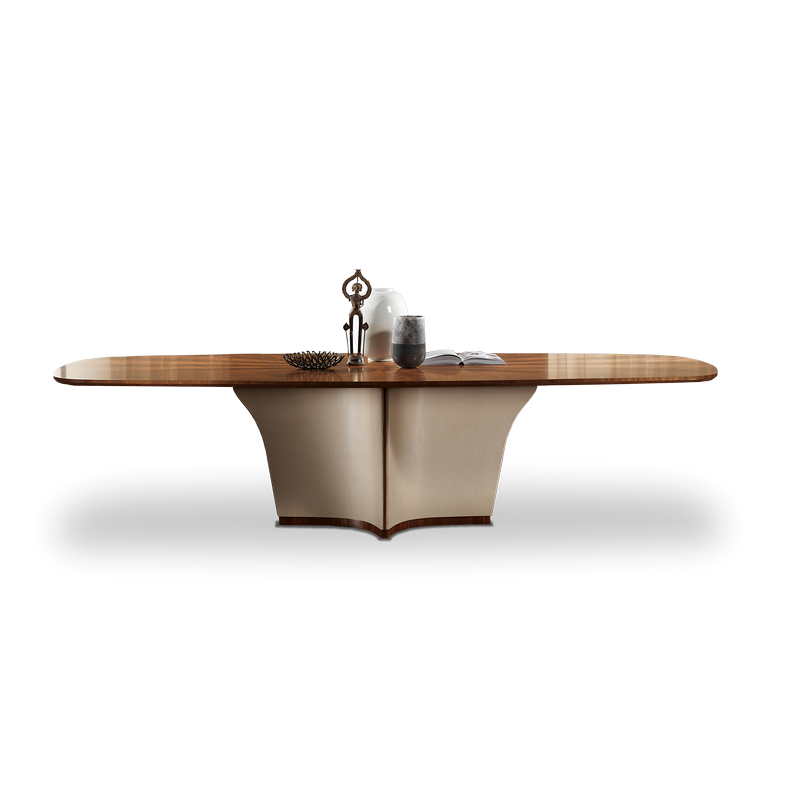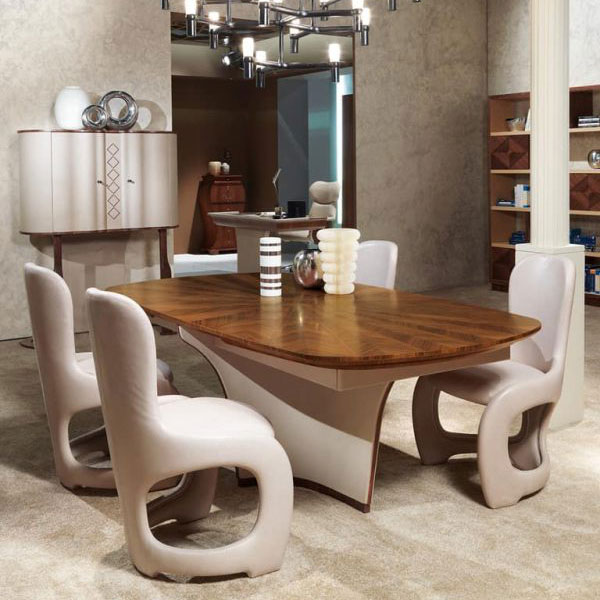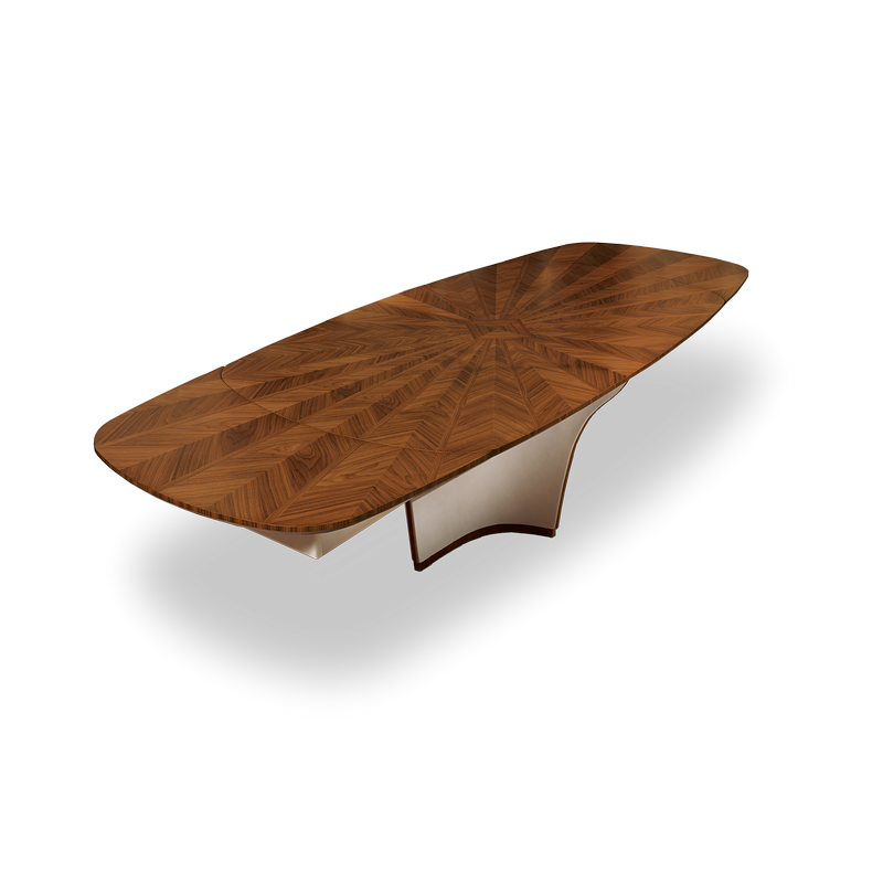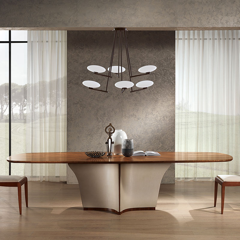 Table available in fixed oval shape and extendable and round oval shape. Wooden structure covered in leather with wooden details. Wooden top with geometric inlay with essences of Light Frisé Sycamore and Frisé Eucalyptus (TA64, TA64B, TA64K, TA65) or Canaletto walnut with natural finish and Canaletto walnut with chocolate stained finish (TA60, TA61, TA61B, TA61K).