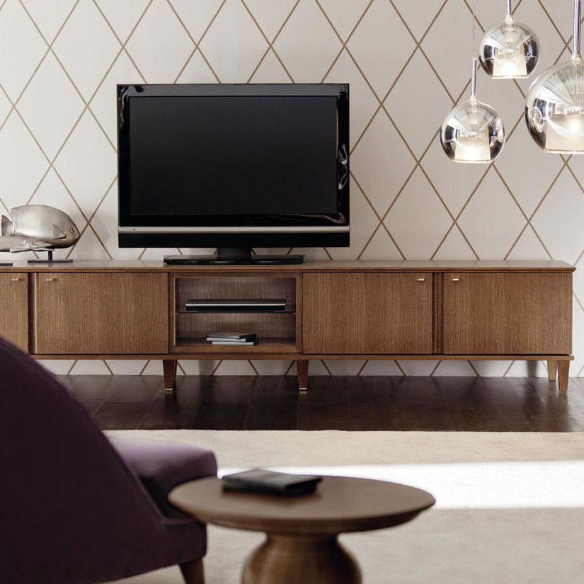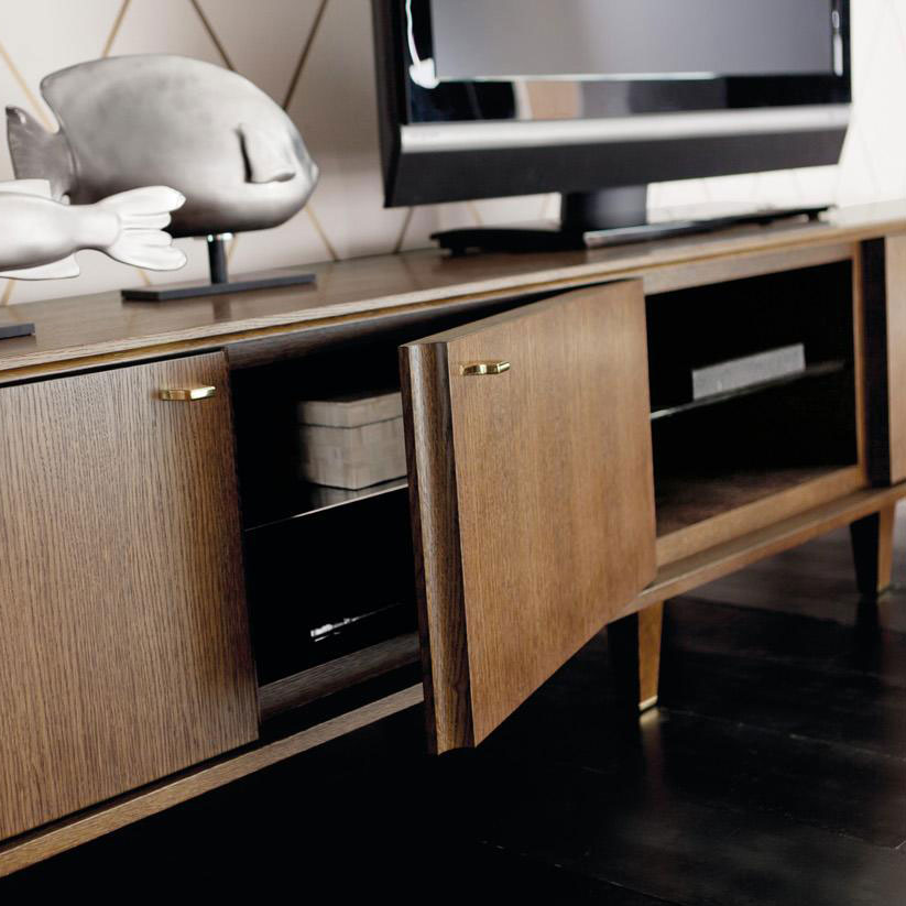 The sleek, sophisticated Desiré TV table is enhanced by the warm texture of ash wood and decorated with cove edges and metal details.