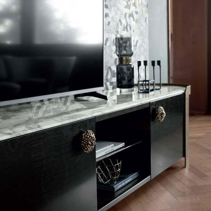 The sophisticated, geometric style – artfully juxtaposing curves and linear designs – exemplifies the sartorial, contemporary essence of Opera Contemporary and its artisan flair. 41095/F: 20.5″ x 90.6″ x 22.5″ h