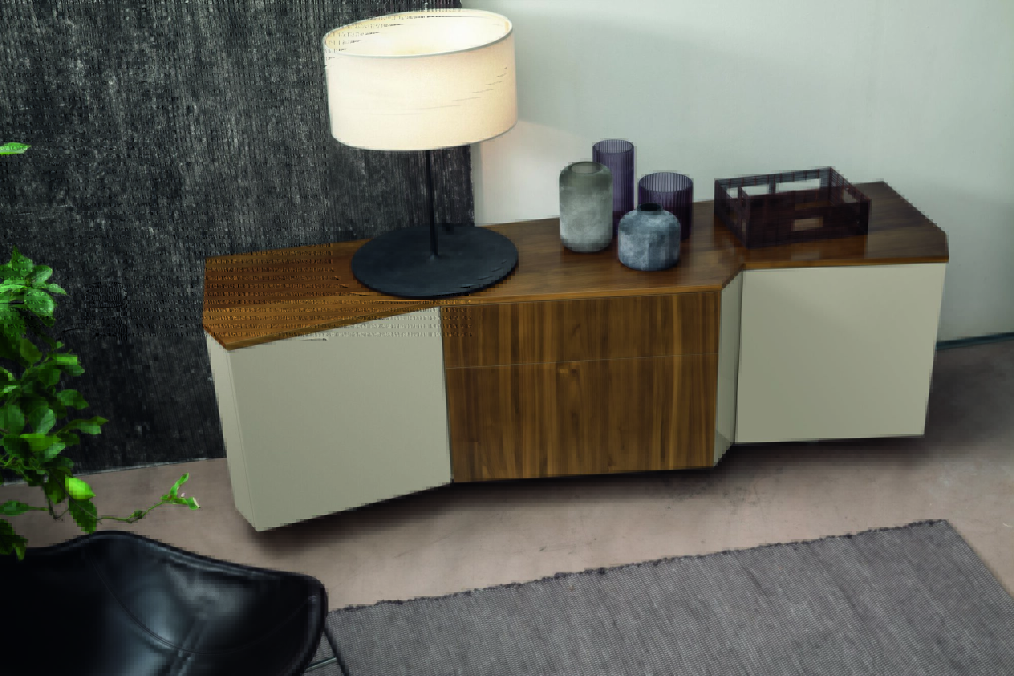 The sophisticated shape of Vanity cupboard glorifies the central element composed of two drawers in walnut wood finish combined with the top. The sand lacquered doors and sides reflect the light with different inclinations, resulting in a pleasant range of tones.